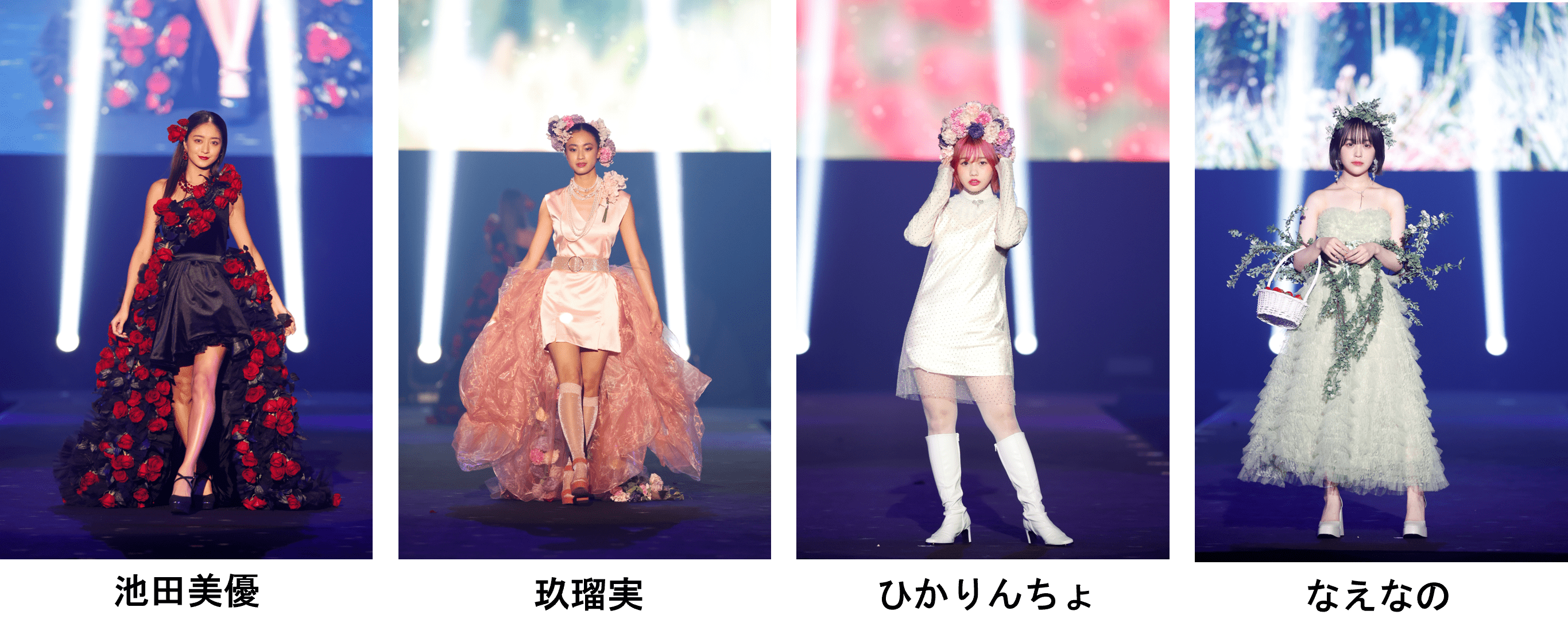 全国屈指の花の生産県であり、「花の都」とも呼ばれる静岡県のステージには、静岡県に縁のある出演者たちが静岡県産の生花を身にまとって登場。トップバッターには同世代にカリスマ的人気を誇るモデルで、静岡県生まれの池田美優が、このステージのために作られた約500本の赤いバラのオリジナルドレスに身を包み登場し会場を魅了しました。続いて静岡県出身のモデル玖瑠実や、Z世代からの熱い支持を受けるひかりんちょが静岡県産のスイートピーやカーネーション、ドレスのスカートのように広がる花びらが美しいトルコギキョウをまとって登場。SNS総フォロワー数約600万人を誇るインフルエンサーなえなのは、春に小さな白い花を手毬のように咲かせるコデマリを身につけ、静岡県生まれの水々しいいちご「きらぴ香」や「紅ほっぺ」が詰まったカゴを持って登場しました。
