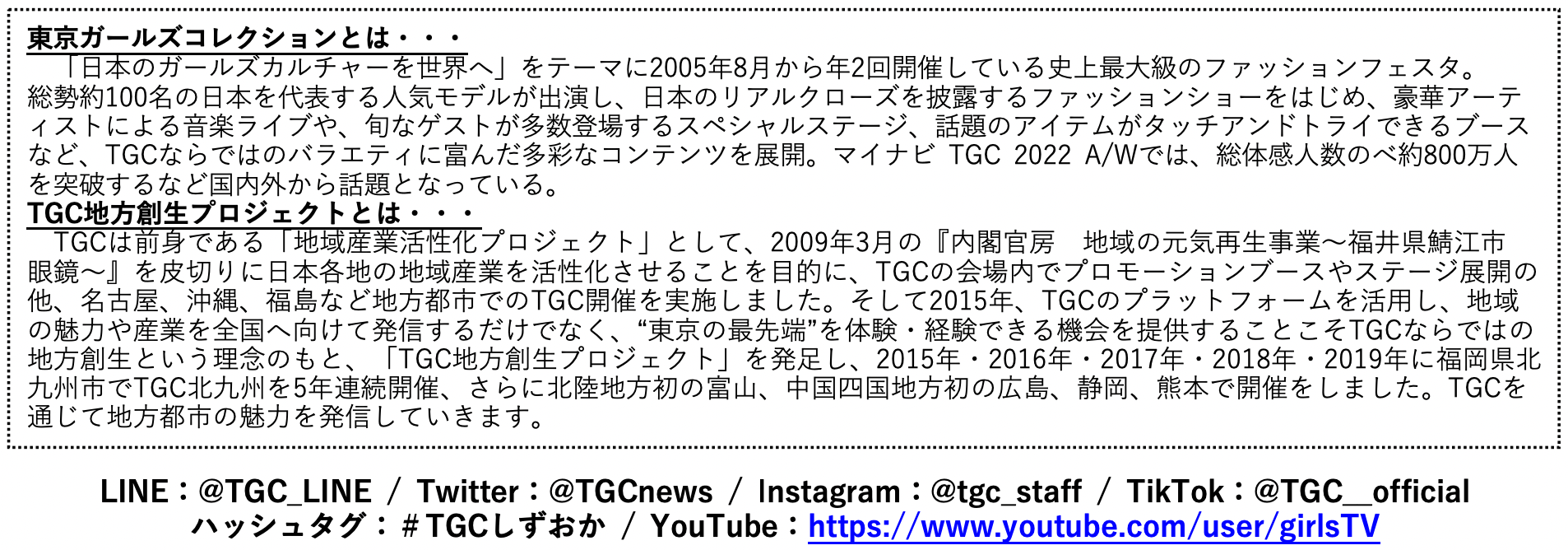 | ブランド:dazzlin、EVRIS、jouetie、LAGUA GEM、Levi's®、moment+、MURUA、 one after another NICE CLAUP、REDYAZEL、SHEIN、WEGO、チチカカ 全12ブランド ゲストモデル:嵐莉菜、アリアナさくら、安斉星来、池田美優、石川恋、入江美沙希、江野沢愛美、emma、遠藤さくら(乃木坂46)、王林、大峰ユリホ、岡崎紗絵、小川桜花(Girls²)、楓、香川沙耶、景井ひな、加藤栞、加藤史帆(日向坂46)、加藤ナナ、金川紗耶(乃木坂46)、金村美玖(日向坂46)、香音、茅島みずき、川口ゆりな、工藤美桜、玖瑠実、小林由依(櫻坂46)、小室安未、紺野彩夏、雑賀サクラ、齊藤京子(日向坂46)、佐々木久美(日向坂46)、せいら、高本彩花(日向坂46)、田鍋梨々花、鶴嶋乃愛、出口夏希、Taeri、トラウデン直美、なえなの、中条あやみ、なごみ、那須ほほみ、新沼凛空、Niki、土生瑞穂(櫻坂46)、原田都愛(Girls²)、ひかりんちょ、藤井夏恋、藤井サチ、マギー、宮本茉由、村上愛花、村瀬紗英、山﨑天(櫻坂46)、ゆうちゃみ、吉田朱里、莉子 ※50音順 全58名 モデル:雨宮由乙花、椎名亜美、髙橋快空、MAAYA、松村キサラ、みりちゃむ ※50音順 全6名 ゲスト:板垣李光人、井上想良、小手伸也、綱啓永、とうあ、土佐兄弟、中町兄妹、バンダリ亜砂也、兵頭功海、平成フラミンゴ、堀未央奈、三浦獠太、もーりーしゅーと、山下幸輝、よしあき&ミチ ※50音順 全15組 シークレットゲスト:権田修一(清水エスパルス) メインアーティスト:OWV、Girls²、Da-iCE、とうあ、MA55IVE THE RAMPAGE ※50音順 全5組 オープニングアクト:ZILLION、超ときめき♡宣伝部、TiiiMO ※50音順 全3組 MC:竹内由恵、ハリー杉山 ※50音順 オフィシャルサポーター:広海・深海 公式TikTokアンバサダー:折田涼夏、本望あやか ※50音順 ステージ内容:ファッションショー、アーティストライブ、パートナーステージ、パートナーブース 他 主催: 東京ガールズコレクション実行委員会 共催:静岡県、静岡市 後援:国連の友Asia-Pacific プラチナパートナー:株式会社シャンソン化粧品 パートナー:イオンクレジットサービス株式会社、SBCメディカルグループ、スズキ株式会社、SHOWROOM株式会社、アサヒ飲料株式会社、エスエスケイフーズ株式会社、マルコ株式会社、ピーコック魔法瓶工業株式会社、ショップジャパン、静活株式会社、ヤマハ株式会社、THE CONDITIONING ROOM 他 ※ランク別、50音順 全19社 公式メディア:girlswalker 演出:DRUMCAN 企画/制作:株式会社W TOKYO |