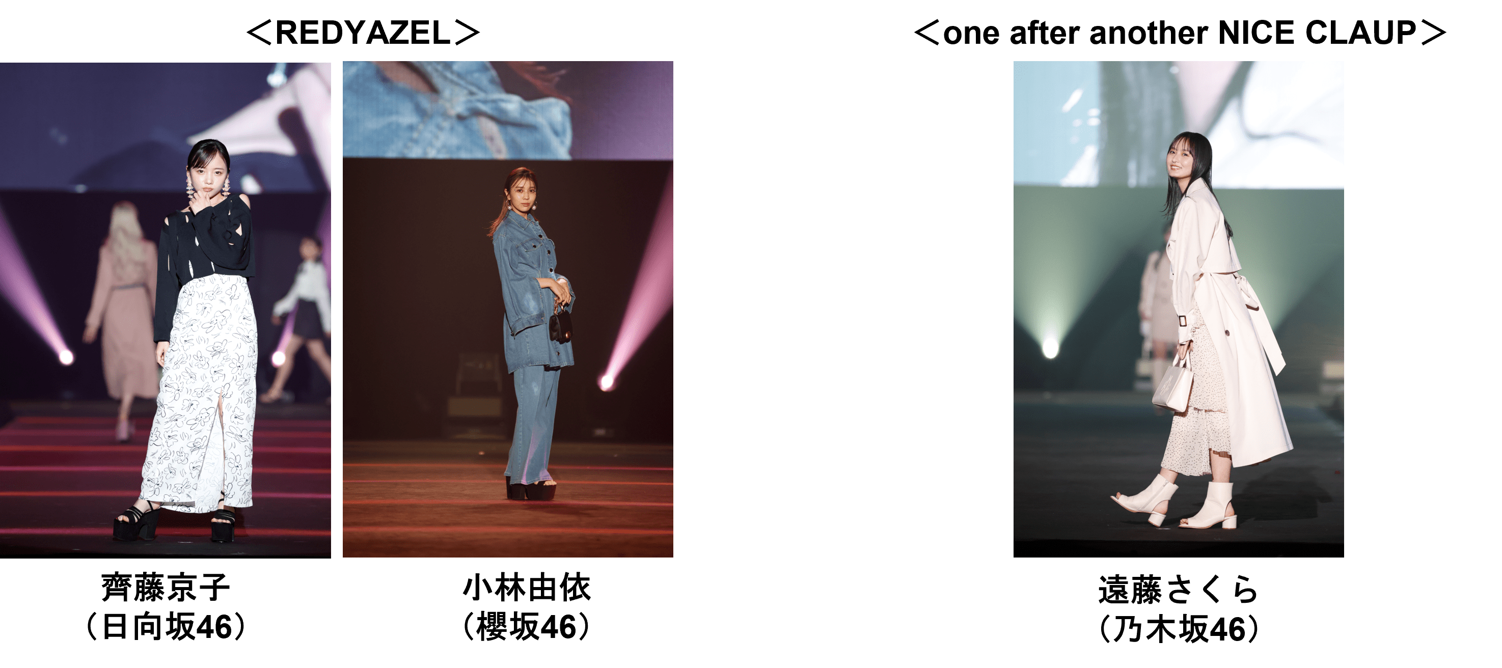 REDYAZELは「TROPICAL DECO」をコンセプトに、1930年代にアメリカを彩った陽気で明るいトロピカルデコの建築を思わせるパステルカラーやフレッシュなカラーリングとモダンなアート柄を中心に、ラメやメタリック使いで装飾的でありながら、シアー素材とのレイヤードで全体がソフトなコーディネートを提案。齊藤京子(日向坂46)、小林由依(櫻坂46)らが登場しました。