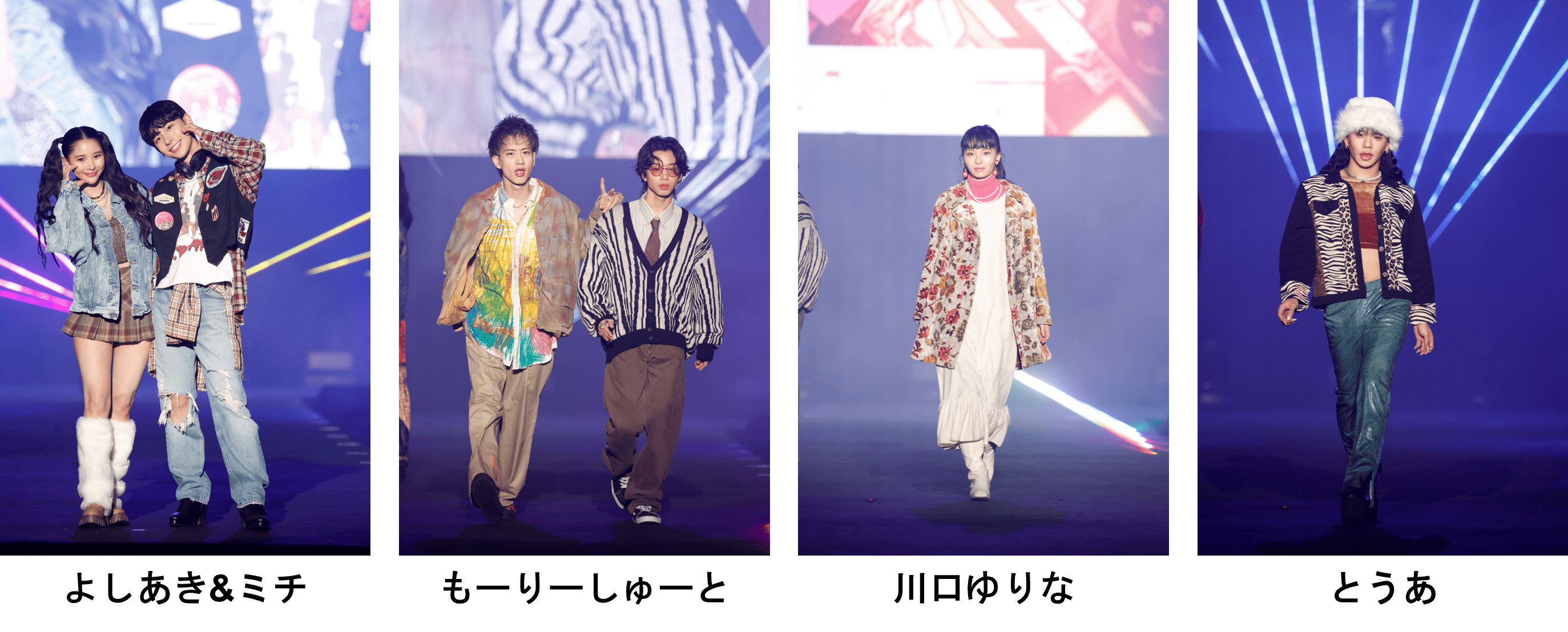 ②WEGOによる「REUSE FASHION STAGE」では、リアル姉弟よしあき&ミチや兄弟ユニットもーりーしゅーと、川口ゆりな、さらにとうあら、Z世代最注目の出演者たちが登場。WEGOの原点でもある“古着”アイテムで組まれたコーディネートで循環型ファッションを提案し、SDGs目標12、13、17を推進しました。