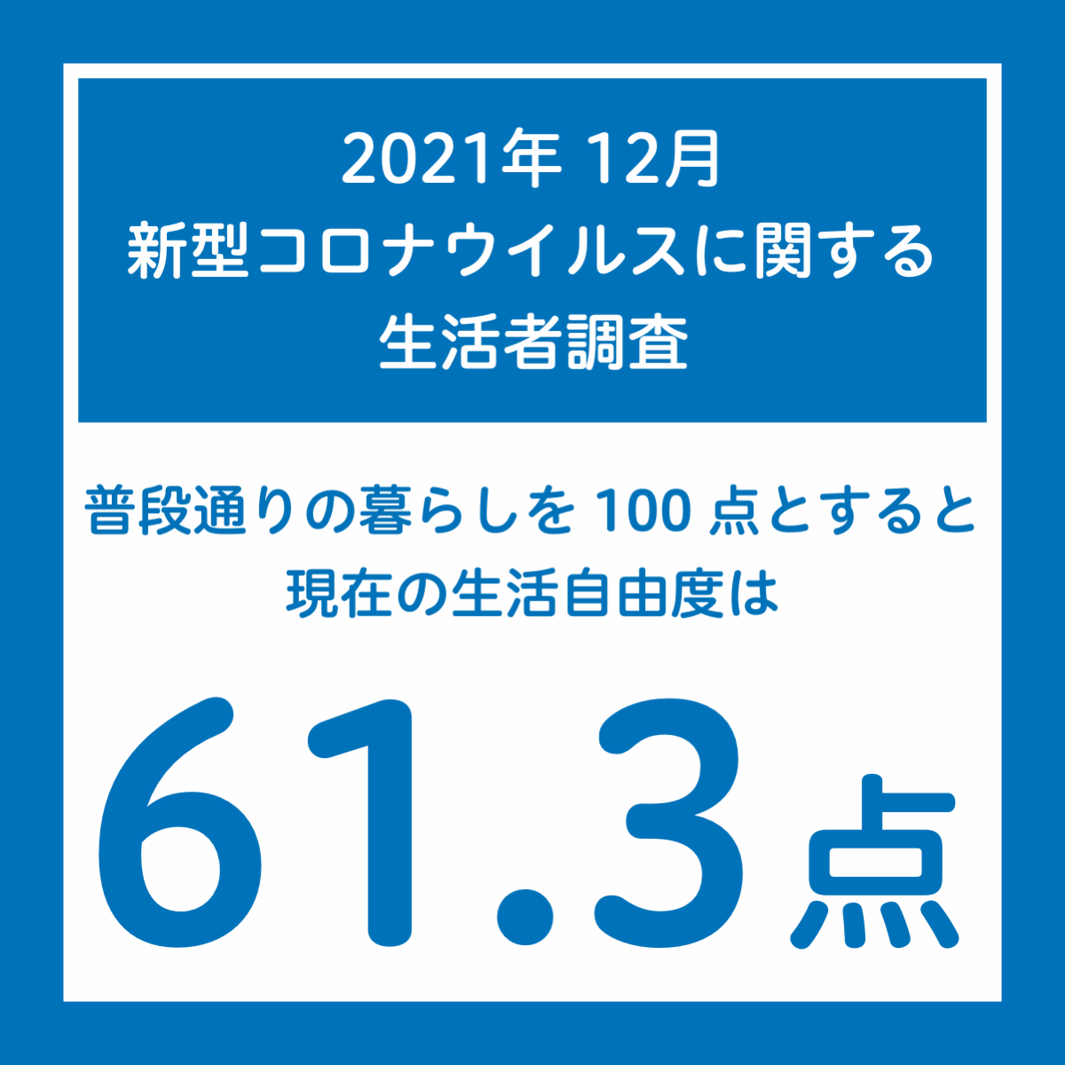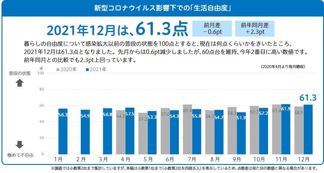 | 12月の「生活自由度」は61.3点、先月から微減だが今年2番目の高さ。 オミクロン株懸念を受け、「不安」は高まる |