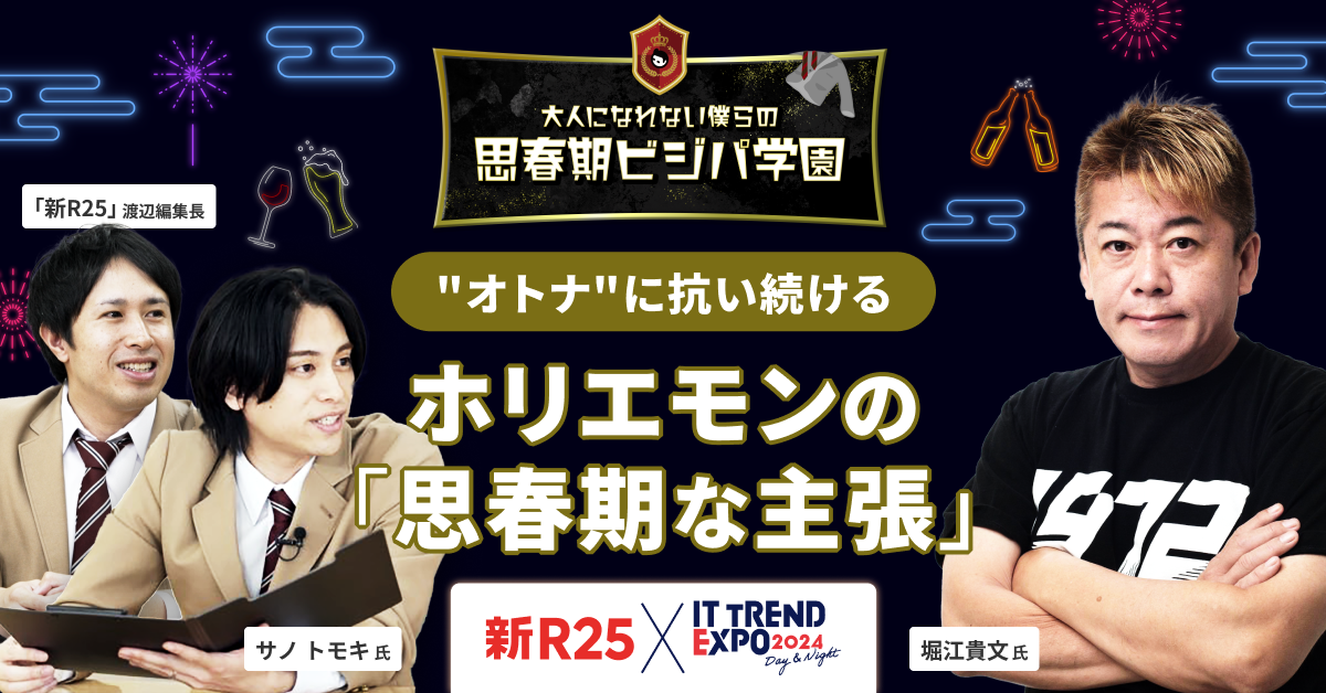 世の中の「デキる大人像」にモヤモヤを抱えたゲスト(=思春期ビジパ)を迎え、"自分らしい社会の生き抜き方"を議論するトーク番組「思春期ビジパ学園」。2023年末でシーズン1終了を発表した同番組が一夜限りの復活!復活特別回のゲストは堀江貴文さん。「大人になりたくない」堀江さんから、どんな"思春期な主張"が飛び出すのか?