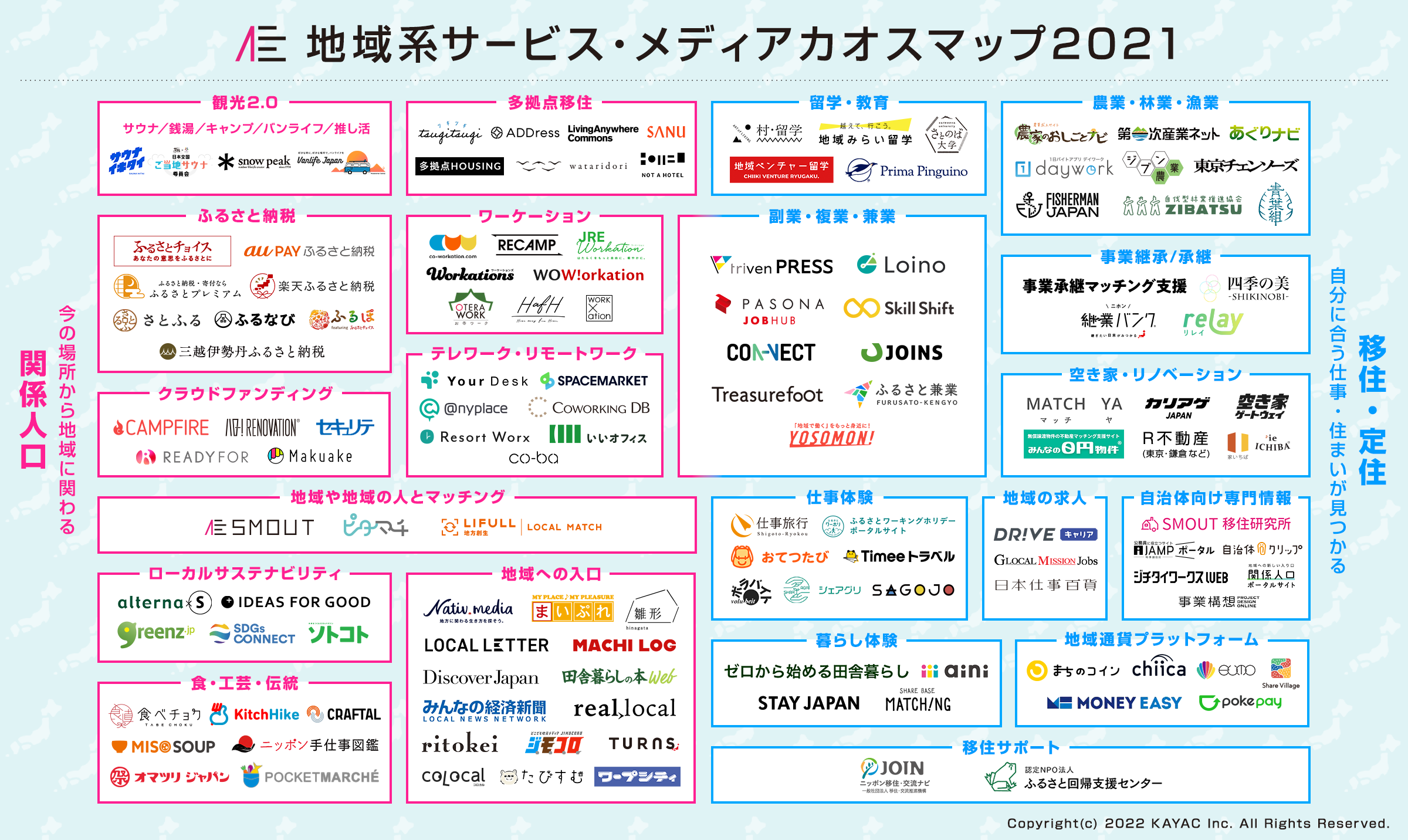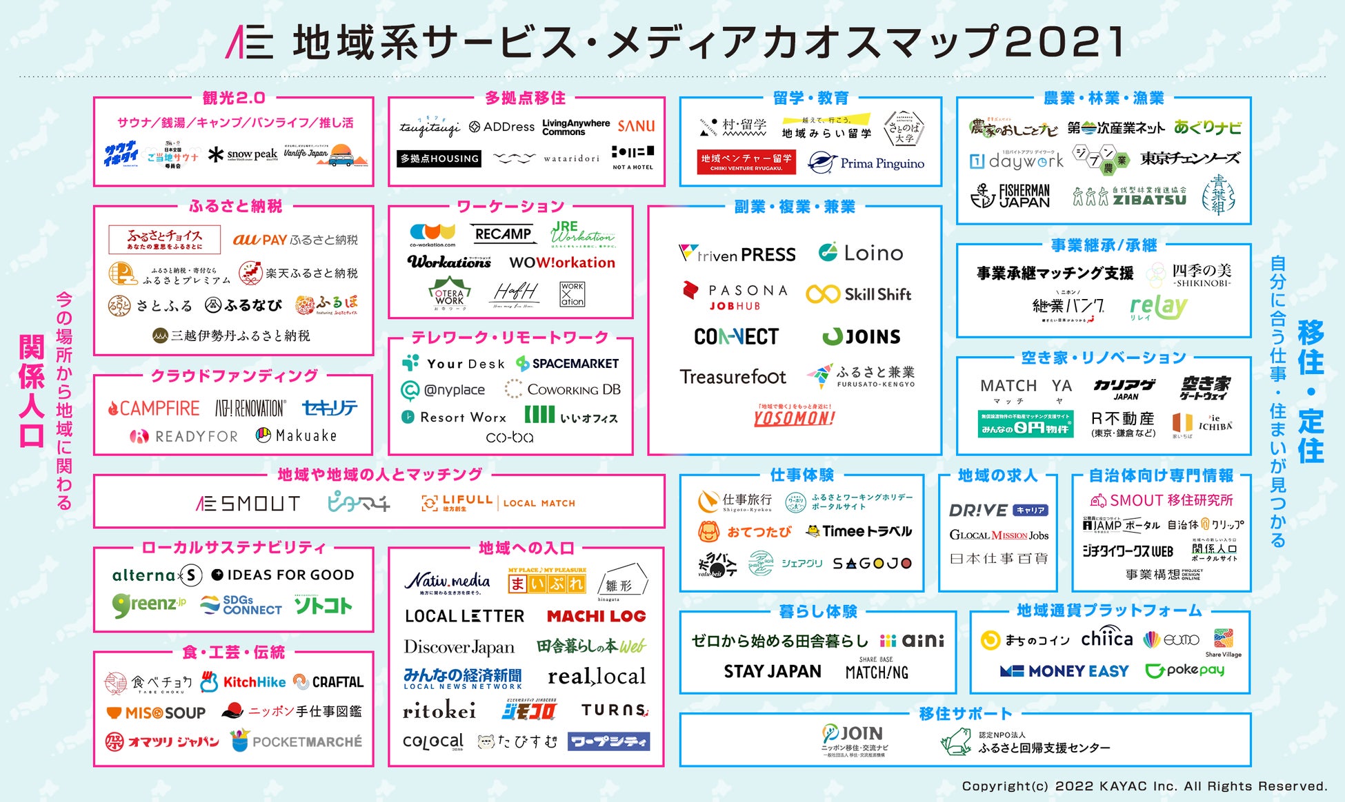 移住・関係人口促進のためのマッチングサービス「SMOUT」を運営する株式会社カヤック(本社:神奈川県鎌倉市、代表取締役CEO:柳澤大輔)が、関係人口から移住・定住に関するサービス・メディアをまとめた「地域系サービス・メディアカオスマップ2021年度版」を本日公開いたしました。
