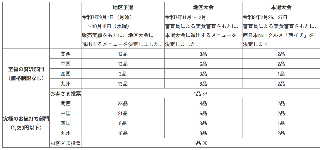 地域の食材を活かした“新たな「肉」グルメ”111メニュー(エントリーメニュー)の中から、地区大会を勝ち上がった14メニューとお客さま投票で選出された2メニューが令和8年2月26日(木曜)、27日(金曜)開催の本選大会に進出し、料理専門家等による厳正な実食審査を経て、西日本の№1グルメ「西イチ」を目指します。