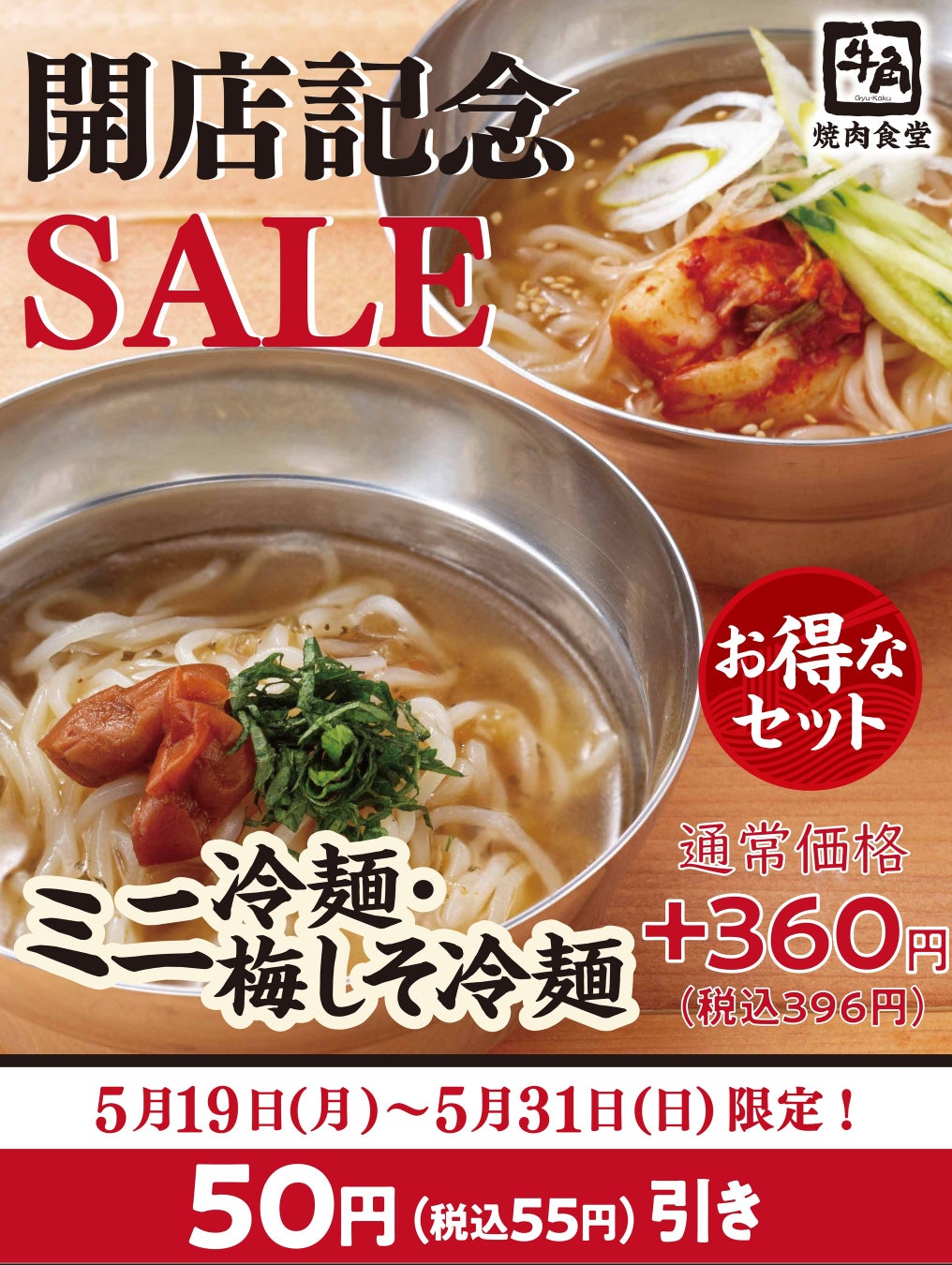 今回、「牛角焼肉食堂 ららぽーと沼津店」限定で開店記念SALEとして、2025年5月19日(月)~5月31日(土)の間、セットの「ミニ冷麺・ミニ梅しそ冷麺」を通常価格360円(税込396円)のところ、50円(税込55円)引きでご提供いたします。この機会にぜひ、牛角で人気の冷麺をお得にお試しください。