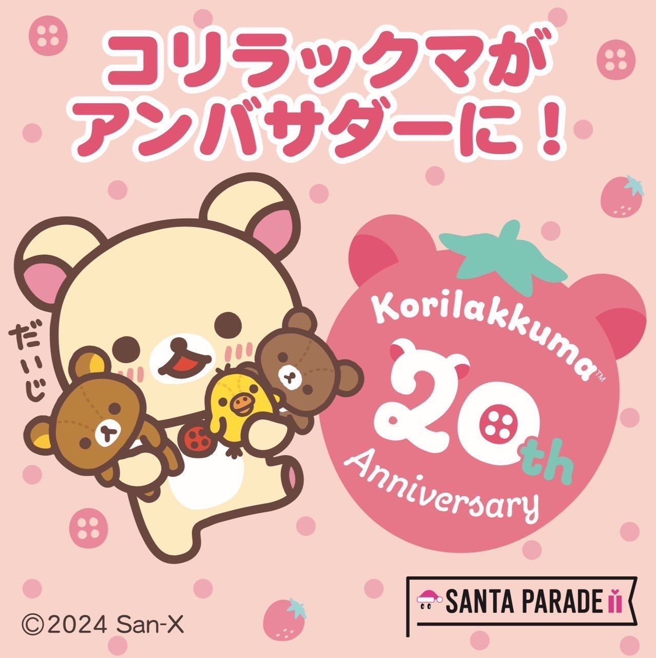 サンエックス株式会社(本社:東京都千代田区、以下サンエックス)は、病気とたたかう子どもたちにクリスマスプレゼントを贈るチャリティーイベント「サンタパレード東京・大阪」にて、コリラックマが初めて「スペシャルアンバサダー」に就任したことをお知らせします。