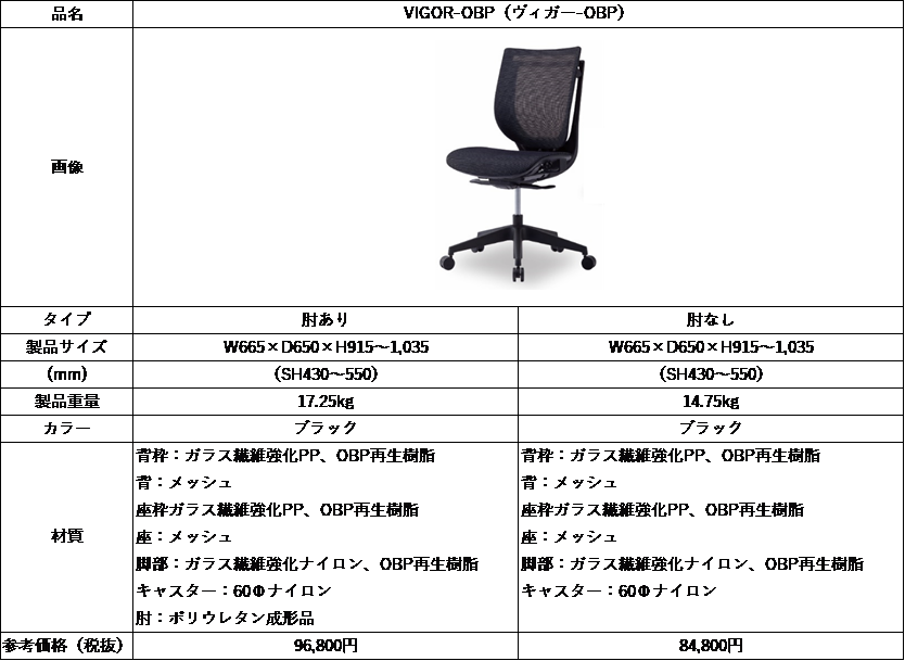 国内オフィス家具メーカー初(※1)海洋プラスチック再生樹脂を採用したオフィスチェア「VIGOR(ヴィガー)-OBP」新発売