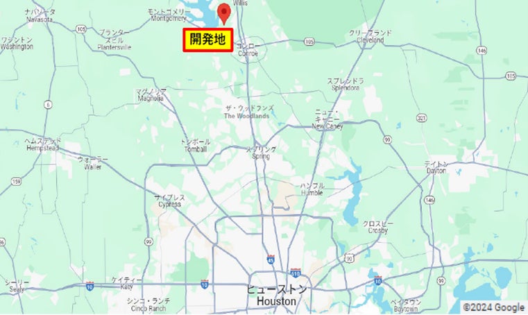 開発地はテキサス州ヒューストン北部のコンロ―市に所在し、同市のダウンタウンまで車で約10分と生活利便性が高く、またULI※2特別優秀賞を受賞した計画都市ザ・ウッドランズまで約20分と交通利便性の高いエリアです。また、ヒューストンまでは約40分の距離に位置しております。