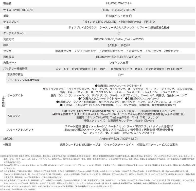 ※4:超長時間バッテリー持続モードの通常使用:工場出荷時設定、超長時間バッテリー持続モードを有効、Bluetooth通話30分/週、音楽再生30分/週、心拍数モニタリング有効、HUAWEI TruSleep™有効、ワークアウト90分/週(GPS有効)、メッセージ通知有効(SMSメッセージ50件、通話6件、アラーム3件/日)、画面オン200回/日。ファーウェイラボのテスト結果に基づきます。製品サイズ、製品重量、関連仕様は、製品個体により若干異なる場合があります。実際の製品に準拠します。