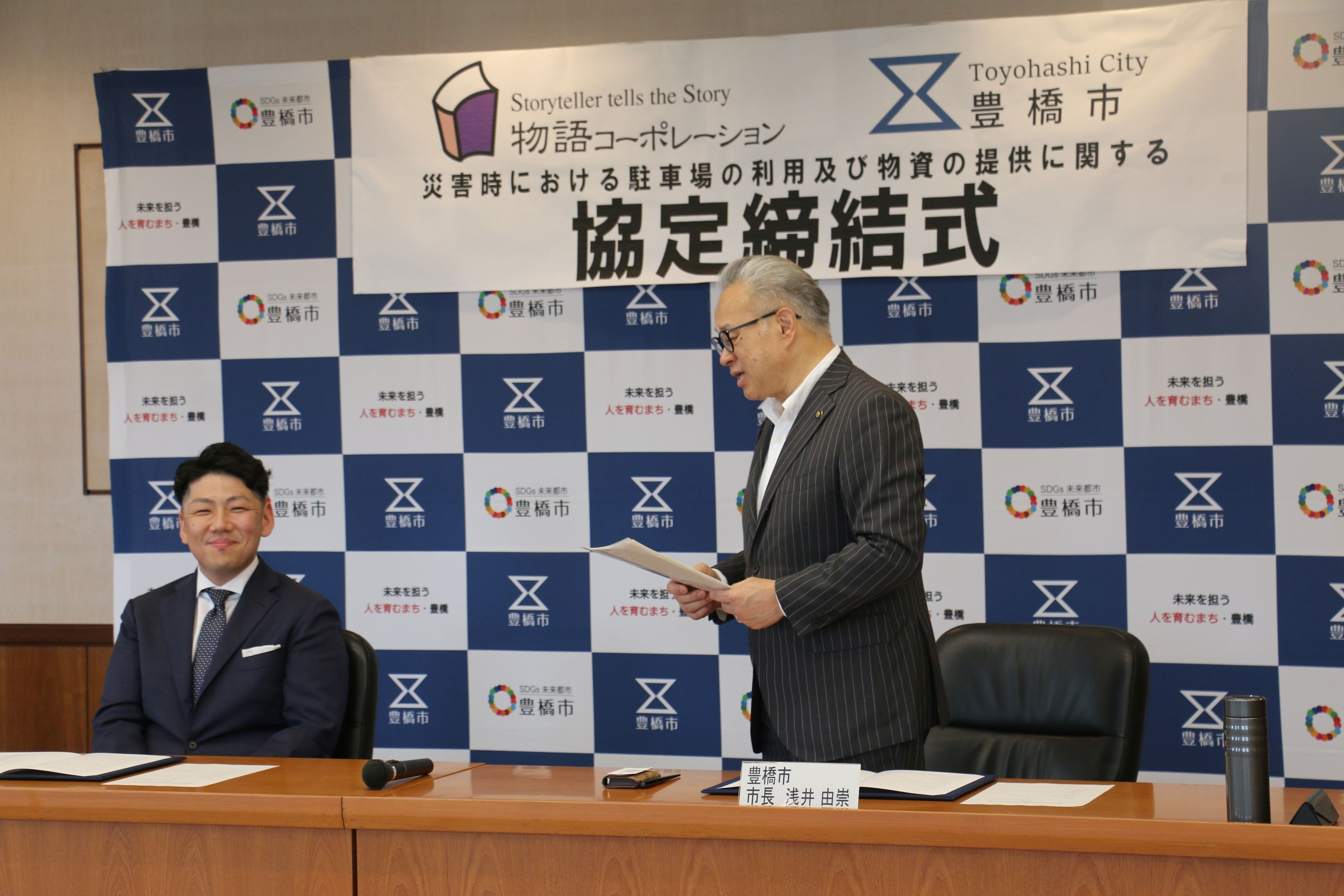 株式会社物語コーポレーションの加藤央之社長は「地方自治体との協定締結は、防災分野に限らず、初めての取り組みになります。まずは創業の地である豊橋市からと思い、協定締結に至ったことを嬉しく思います。災害時には少しでも協力できればと思います。」とコメントし、豊橋市の浅井由崇市長は「地域の災害対応力の向上に繋がります、本当に感謝いたします」と述べました。