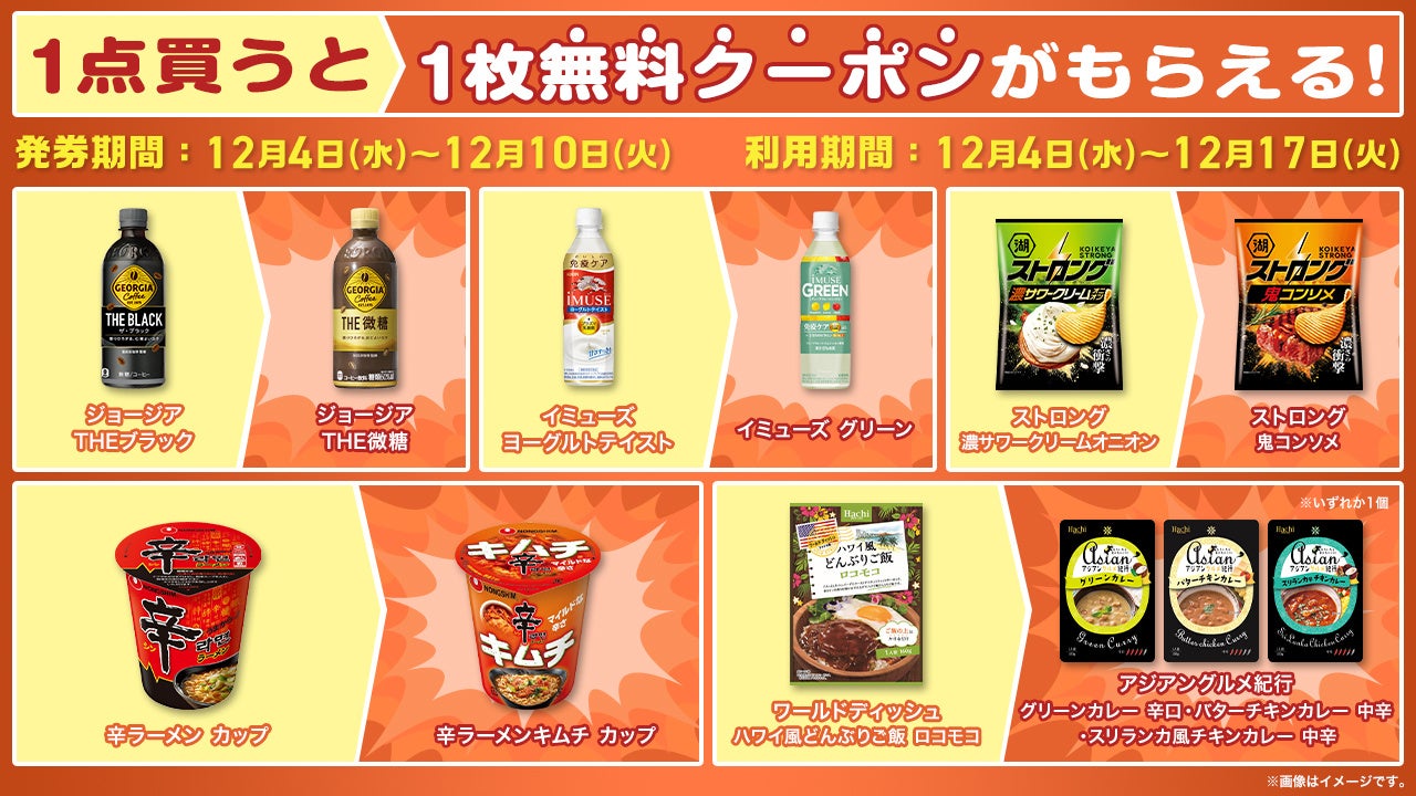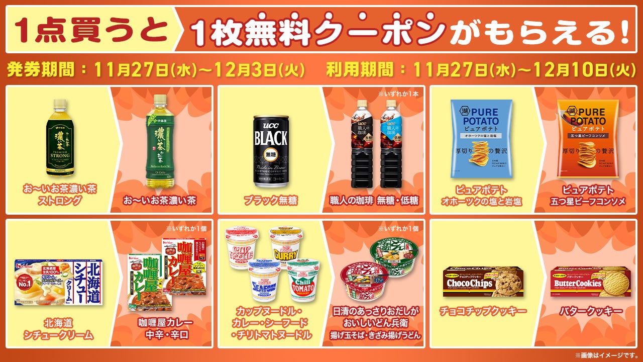 さらに、「デカ盛りチャレンジ」と合わせて展開するお買得施策として、2024年11月27日(水)から12月10日(火)まで、 “1個買うと1個もらえる”「1BUY1フェア」と題して、飲料やお菓子、カップラーメンなど対象商品を買うと無料引換券がレシートについてくるキャンペーンを実施いたします。第1弾は、11月27日(水)から12月3日(火)までを対象に6企画、第2弾は12月4日(水)から12月10日(火)までを対象に5企画と、盛りだくさんの内容でお楽しみ頂けます。