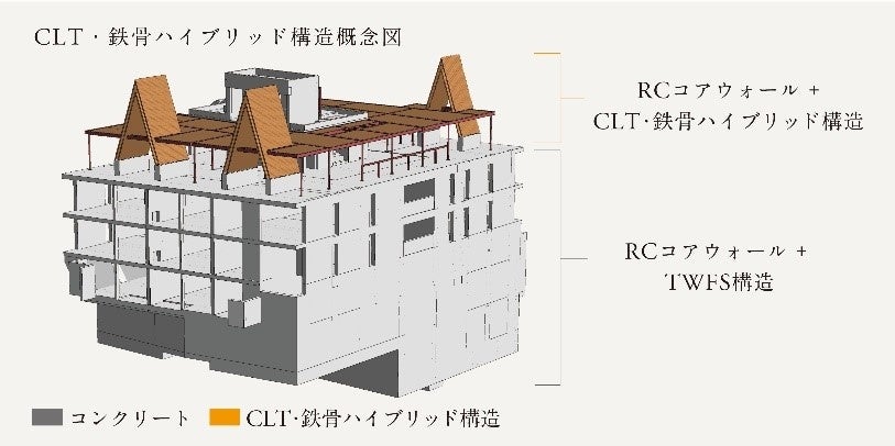 4階・R階はRCコアウォール+ CLT・鉄骨ハイブリッド構造、B2階~3階まではRCコアウォール+TWFS構造(厚肉床壁構造)とし、木と鉄、鉄筋コンクリートを適材適所で使用することで居住環境の確保と木材使用量確保を両立しています。
