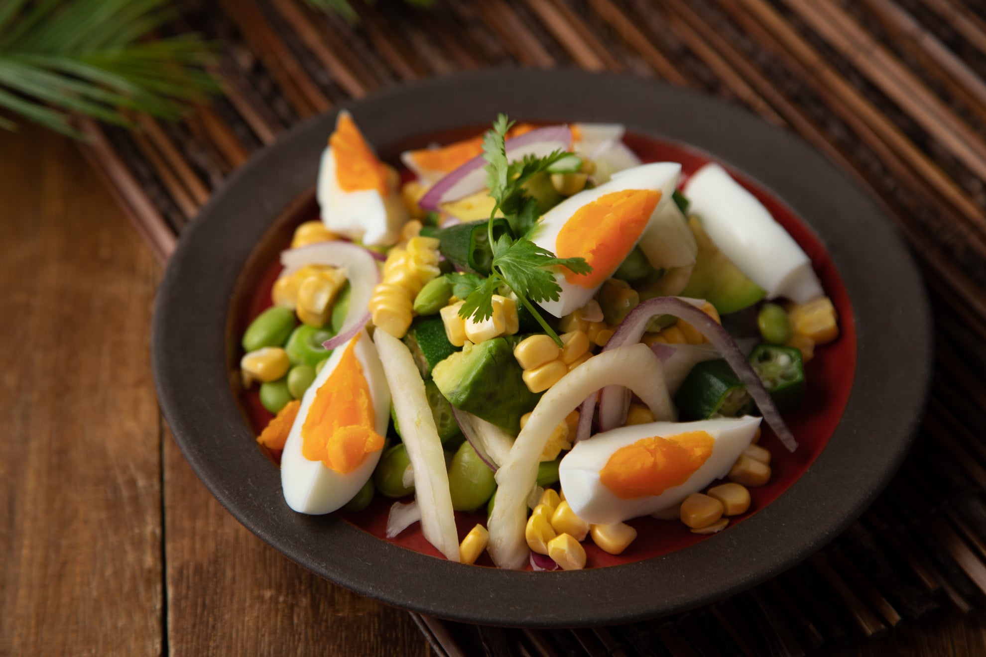 青トマトやパパイヤに生トウモロコシ、オクラ等の夏野菜を入れ、程よい辛さのピキーヌで仕上げる事で辛さと彩りが付いたソムタムに仕上げました。発酵させた海老味噌は隠し味として使用