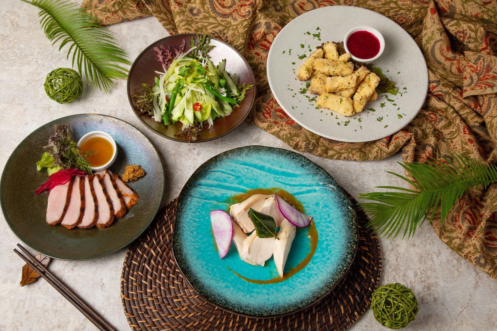 バイマックルでマリネした大山鶏は、低温料理する事で柔らく、ジューシーな味わい。発酵豆を使用したタイチオソースが鶏肉をよりアクセントに仕上げております。