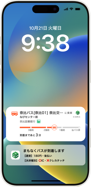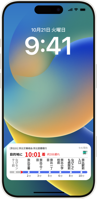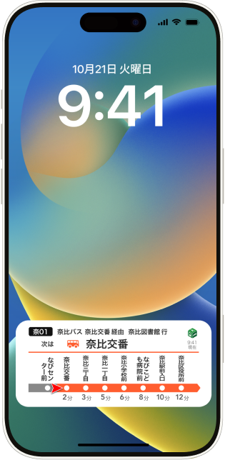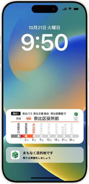 バスの接近情報や停留所(次のバス停)、遅延情報を iPhoneのロック画面に表示させることで、自分専用のバス停や車内ディスプレイが手元にあるような感覚で、バスの状況をひと目で把握できる機能です。