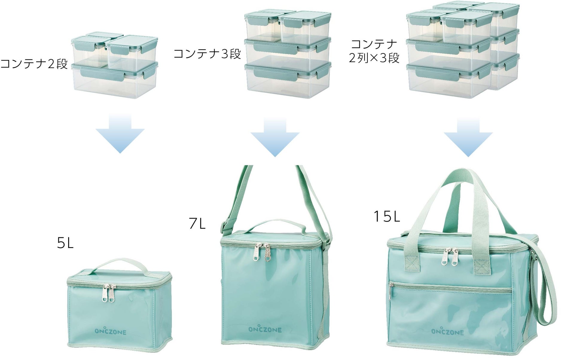 普段使いがしやすい、光沢感のあるON℃ZONEクーラーコンテナ専用のクーラーバッグです。ON℃ZONE クーラーコンテナが2段収納できる「5L」、3段収納できる「7L」、2列×3段収納できる「15L」の3サイズ展開です。余分なスペースなく効率的に保冷することができます。