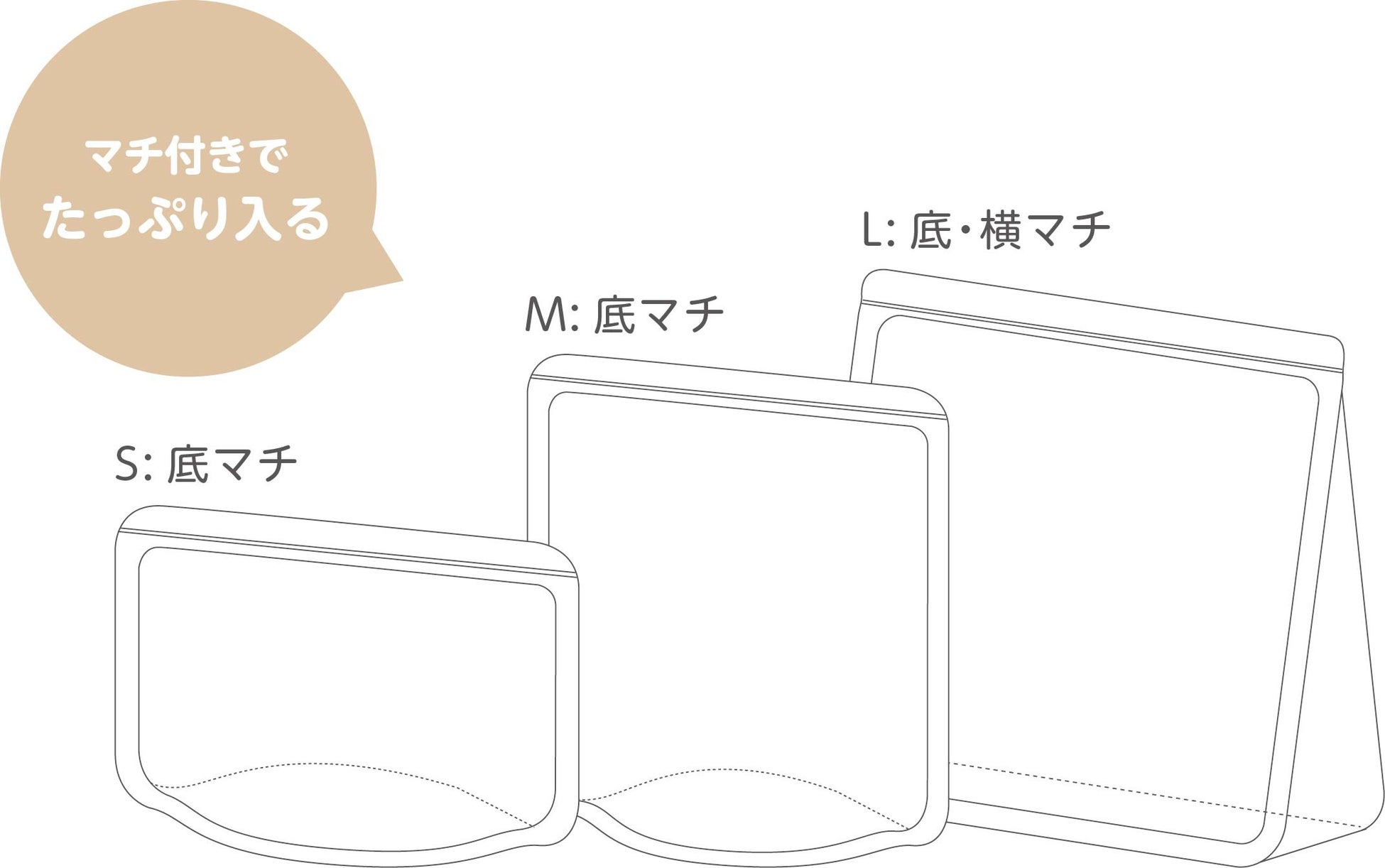 Sサイズ、Mサイズ、Lサイズの3サイズ展開で、全サイズにマチが付いているので、中にたっぷり入ります。使用するシーンや、冷やしたい食品や雑貨に合わせてサイズをお選びいただけます。