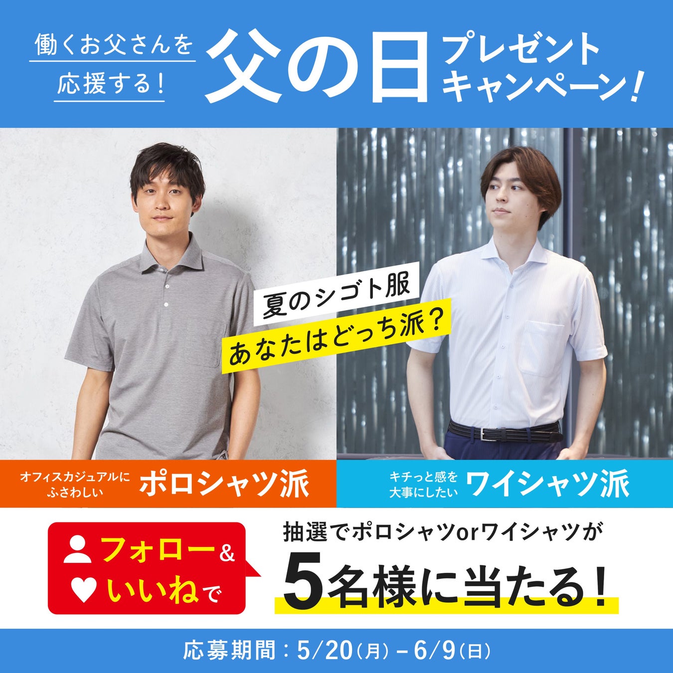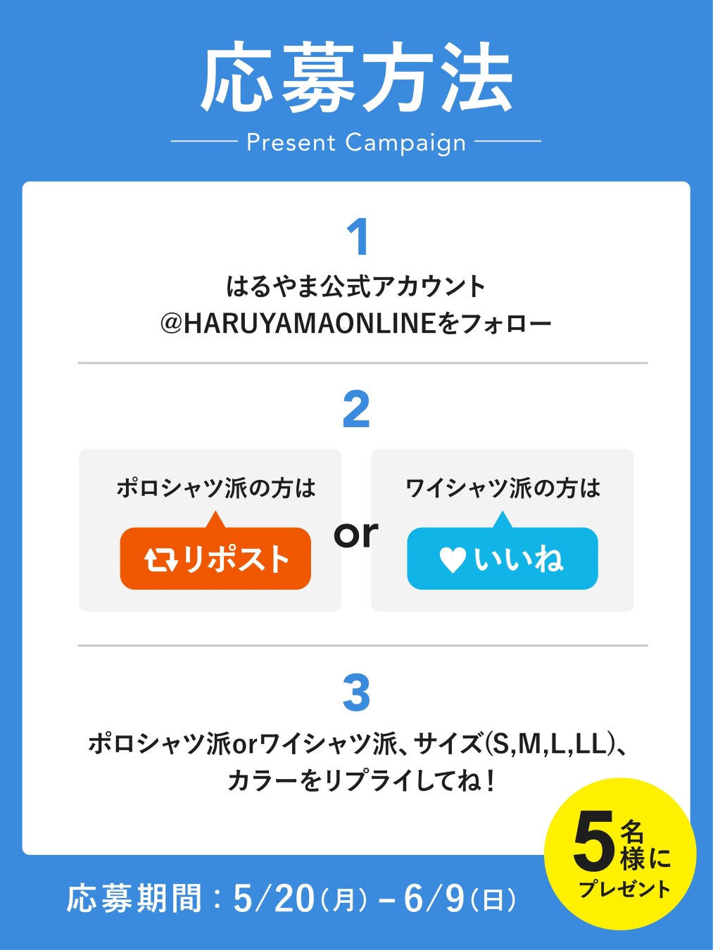 同キャンペーンは、はるやま公式instagramでも同時に開催。はるやま公式instagramアカウント(@haruyama__official)をフォローし、該当投稿にいいね&しコメント欄に、当選したいアイテム(ポロシャツまたは半袖ワイシャツ)を記載していただいた方の中から抽選で5名にポロシャツまたは半袖ワイシャツが当選するキャンペーンを実施いたします。