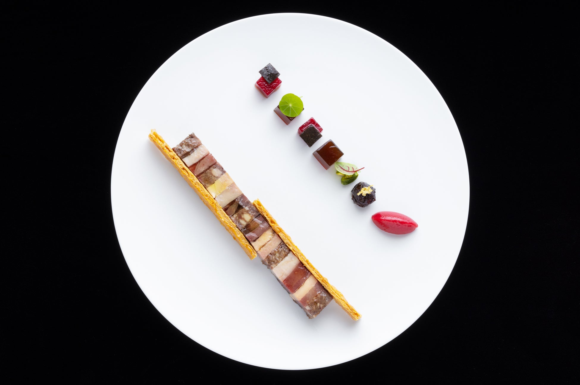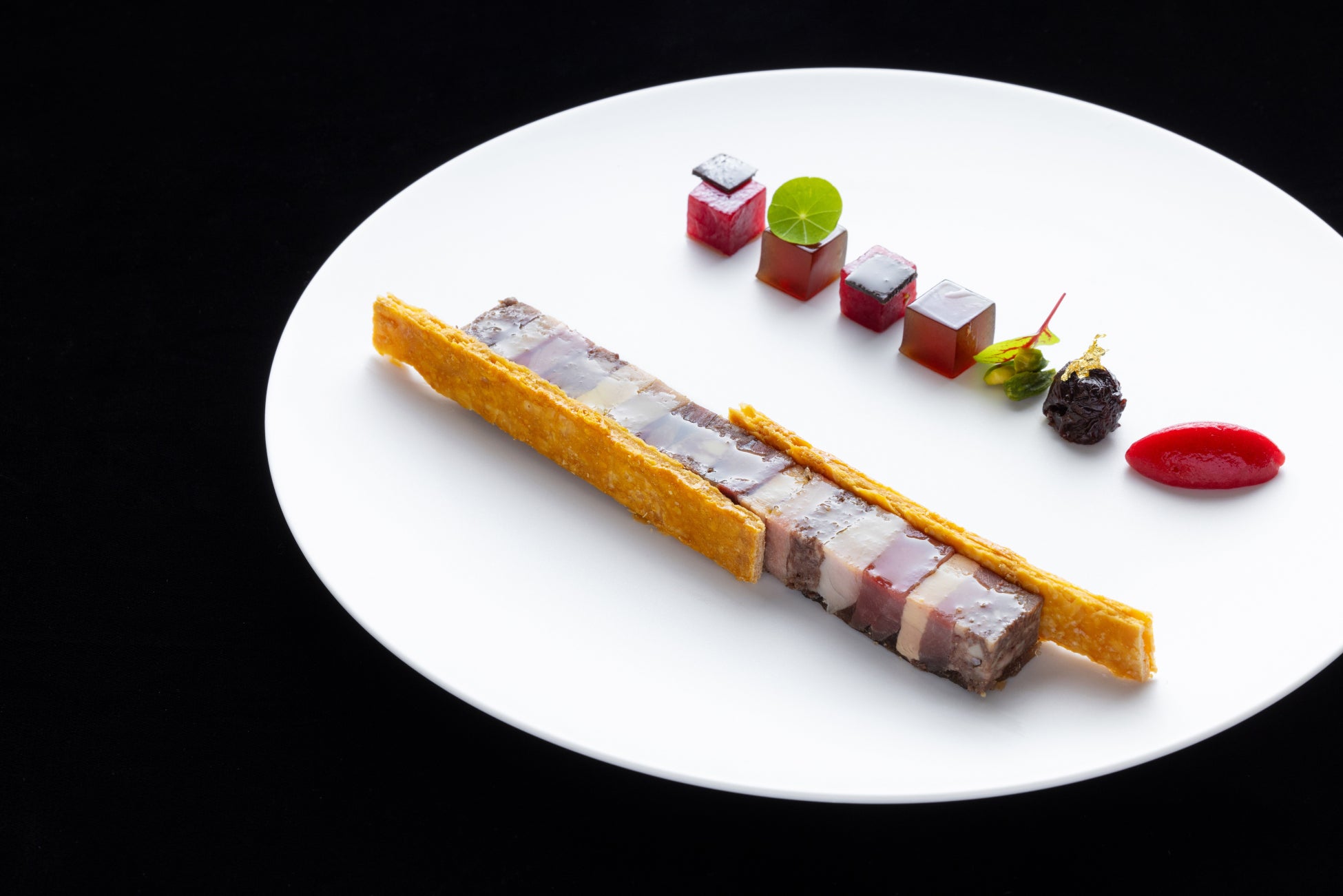 鹿や猪、山鳩、山鶉、青首鴨など数種類のジビエを使った見た目にも華やかな前菜。ジビエの肉質や部位によって、ミンチにしたりモルソー(塊)にしたりと、それぞれの素材に合った調理を施す、ひじょうに手の込んだ料理です。さらに、これらが見せる断面の紋様を思い描きながら何層にも重ねていきます。それはまるで美術品のような美しさです。パテ・ド・ロワは、食感と旨味が異なるジビエを一つひとつじっくりと、目からも味からも楽しむことができます。