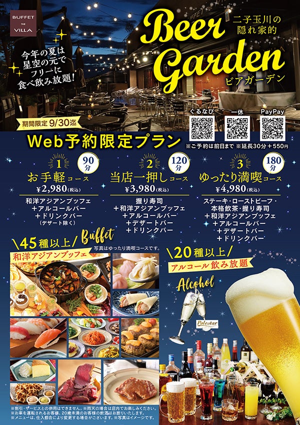 【充実の120分‼食べ飲み放題のビアガーデン‼】緑溢れるテラス席が大人気‼二子玉川の隠れ家的ブッフェ『ブッフェ ザ ヴィラ』にて9/30(土)迄のWEB予約限定のお得な『ビアガーデンプラン』が登場‼