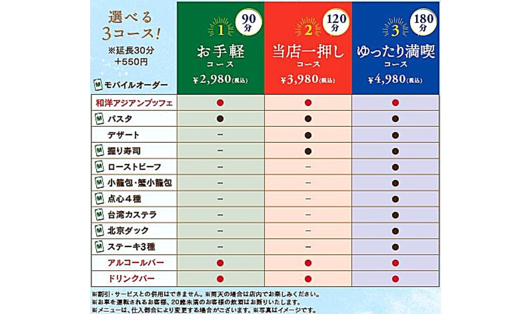 ※握り寿司 / 本格飲茶 / ステーキ3種 / ローストビーフ はオーダーごとにご提供いたします。