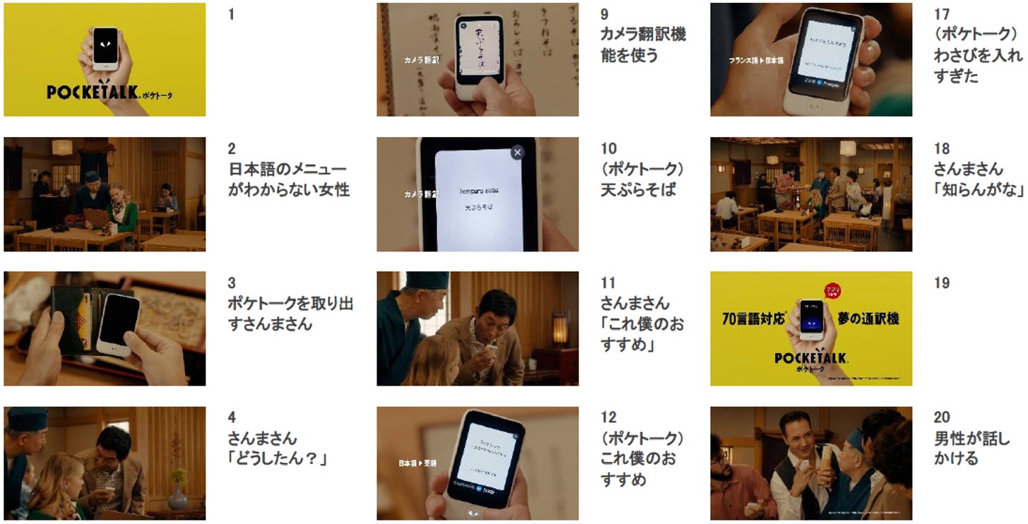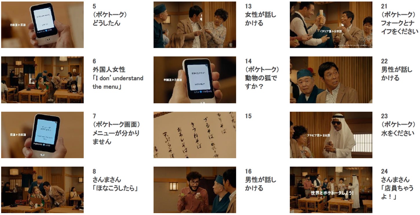 蕎麦屋で日本語のメニューが分からず困っている外国人女性。そこにポケトークを持った明石家さんまさんが「どうしたん?」とポケトークを使って話しかけるところから始まります。カメラ翻訳機能なども使用し、おすすめのメニューを教えると、今度は別の女性から中国語で、また別の男性からフランス語で、そして店内に入るイタリア語、アラビア語を話す男性からも次々とポケトークを使って話しかけられ「店員ちゃうよ!」と明石家さんまさんがツッコむ内容になっています。