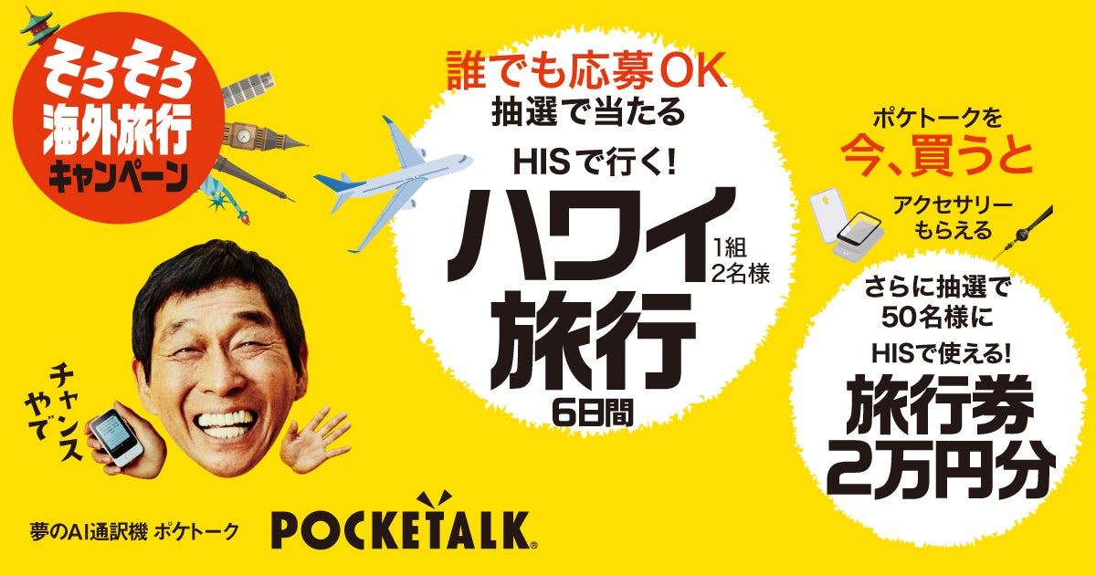 A賞は1組2名様に「HISで行くハワイ旅行6日間」が、B賞は期間中にポケトークをご購入いただき応募いただいた方から抽選で50名様に「HISで使える旅行券2万円分」が当たるキャンペーンを開催いたします。