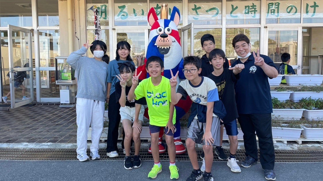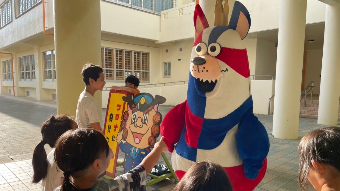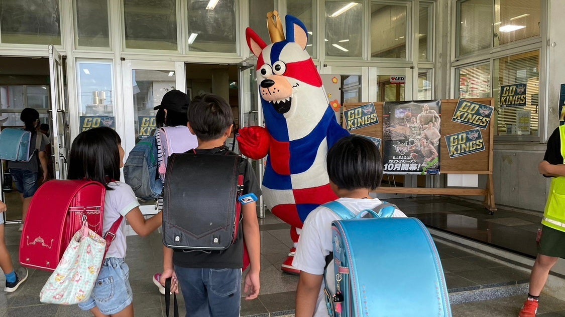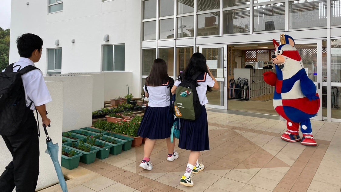 朝の時間もだんだんと涼しい秋風が吹き始め、ラジオ体操をしたりシャボン玉をとばしたり、玄関先に設置されたバスケットボールリングに登校してきた生徒がシュートをしたり、また学校独自のキャラクターがいたりと各学校で工夫された朝の活動がある中、子どもたちと元気に挨拶を交わしました。