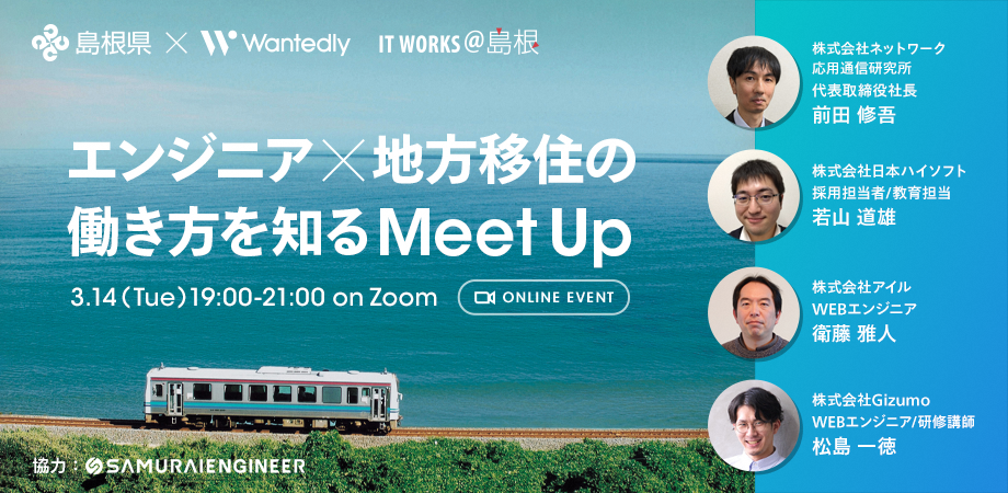 【3/14(火)】4名の経験談から学ぶ地方で歩むエンジニアのキャリアとは?「エンジニア×地方移住の働き方を知るMeet Up@オンライン」を開催。