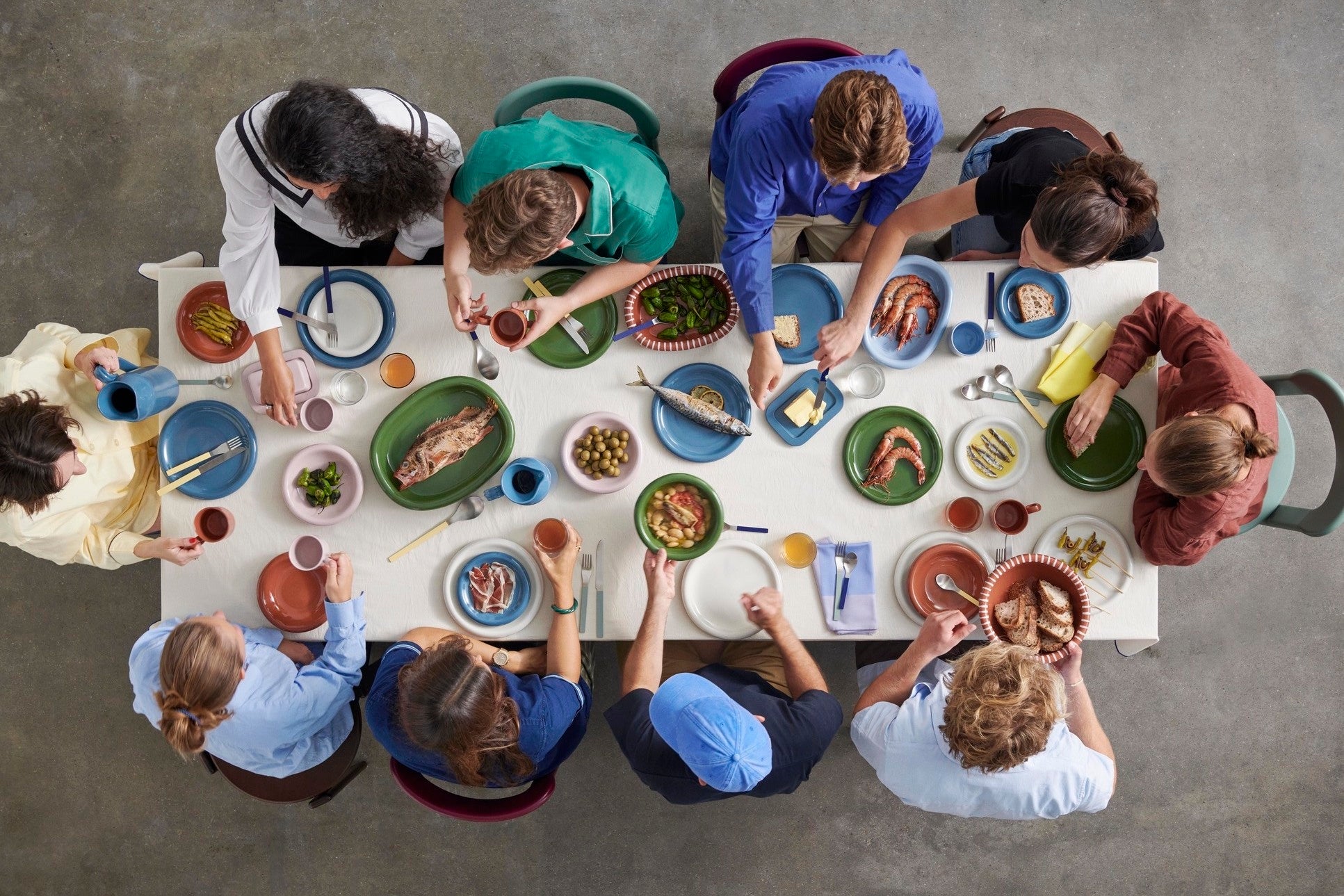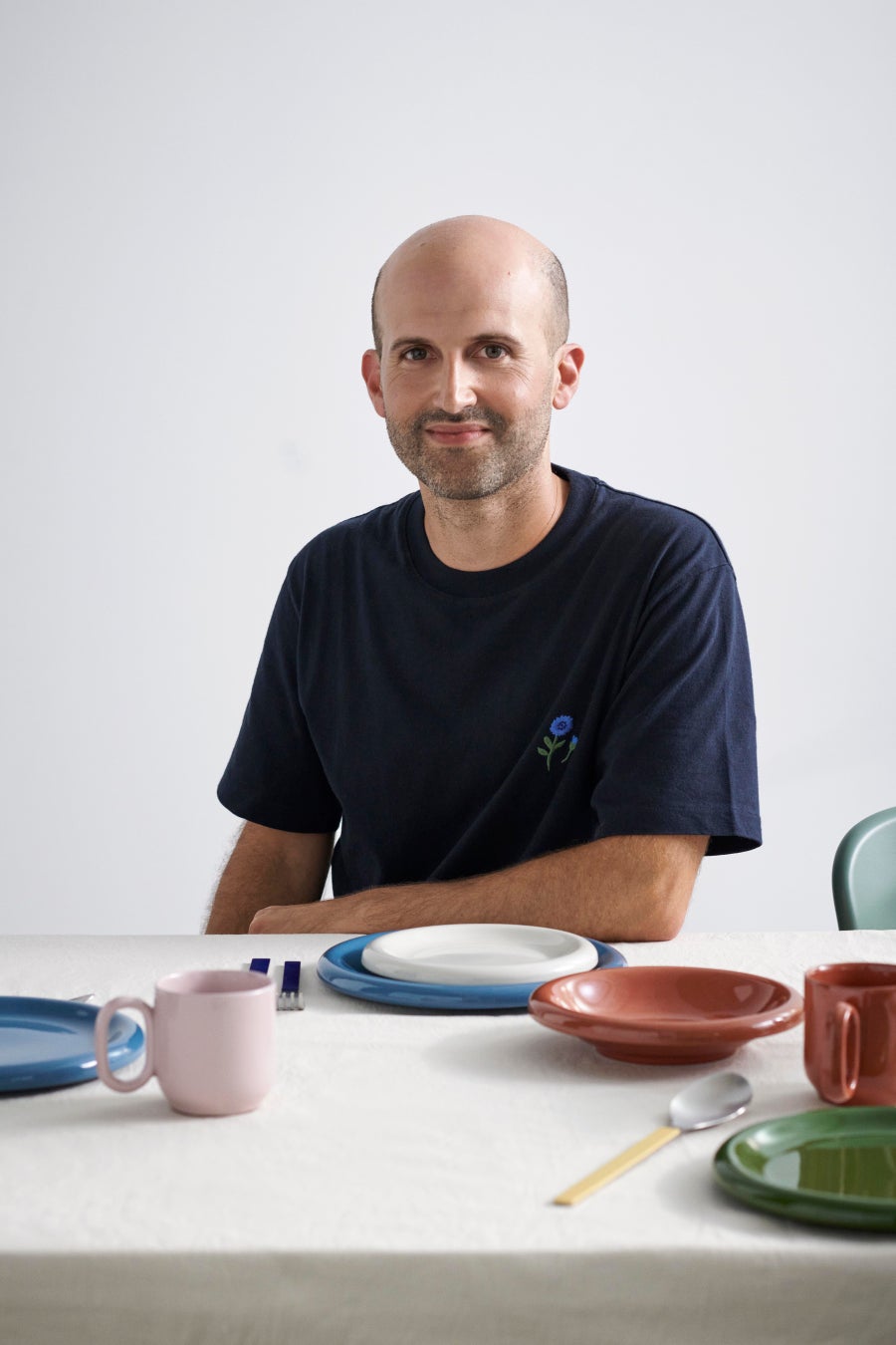 厳選し調整された透明釉と光沢のある色(グリーン、ダークブルー、ライトブルー、オフホワイト、ピンク、ナチュラルテラコッタ)をお楽しみいただけるこの食器は、組み合わせを選びません。しかし「すべてのアイテムについて全色ご用意しているわけではなく、自分の感性で選ぶ余地を残しています」とペレイラがいうように、自由に組み合わせることで、自分だけの食卓シーンを演出していただくことを意図しています。