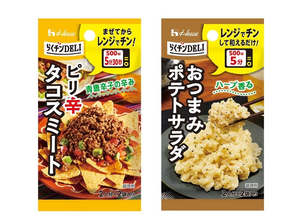 ハウス食品株式会社は、メニューに合わせてスパイスと調味料などをブレンドしたメニュー専用シーズニング「らくチンDELI」シリーズより、<タコスミート>と<おつまみポテトサラダ>を、8月12日(月)からスーパーなどで発売します。