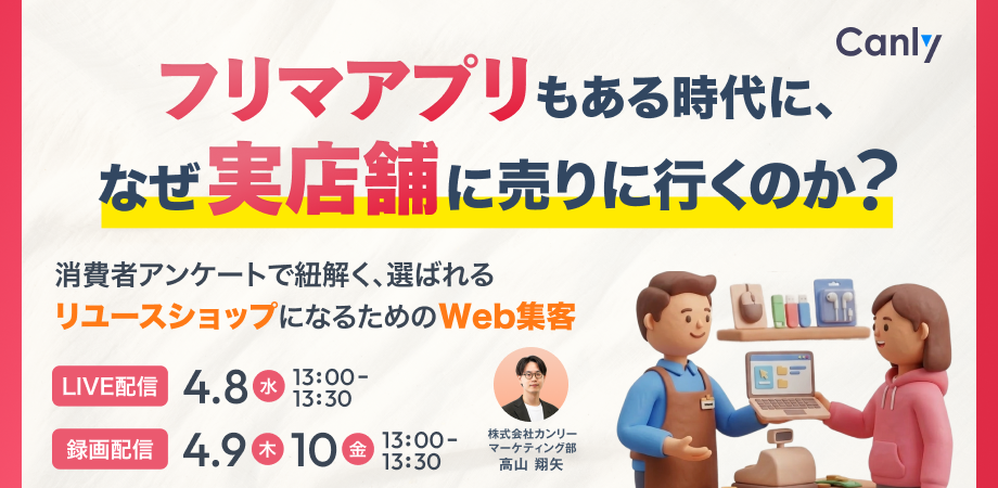 Google ビジネスプロフィール、Yahoo!プレイス、Appleマップなどの3大地図媒体、HP、アプリ、SNSなどの店舗集客媒体の一元管理サービス「カンリー店舗集客」の開発・提供を行う株式会社カンリー(所在地:東京都品川区、代表取締役:辰巳 衛,秋山 祐太朗)は2026年4月8日(水)・9日(木)・10日(金)の3日程で「フリマアプリもある時代に、なぜ実店舗に売りに行くのか? 〜消費者アンケートで紐解く、選ばれる「リユースショップ」になるためのWeb集客〜」をオンラインで開催いたします。