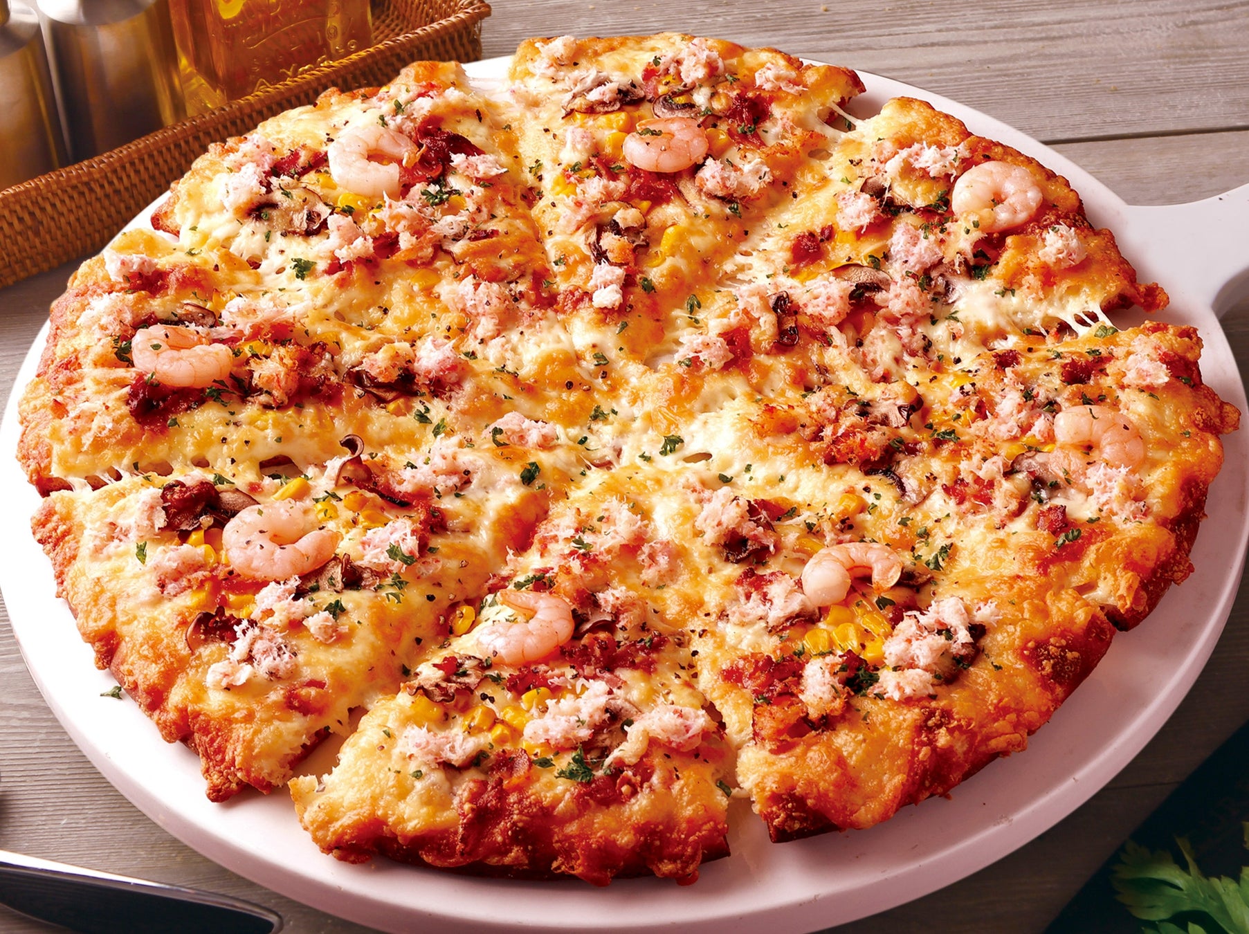 「特製クラブソース」と「特製グラタンソース」の2種類のソースを組み合わせ、カニの風味を引き立てた、まるでカニグラタンのような、やさしくコクのある一枚です。