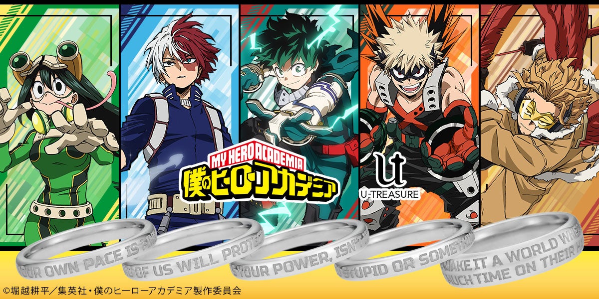 TVアニメ『僕のヒーローアカデミア』に登場する、緑谷出久、爆豪勝己、轟焦凍、蛙吹梅雨、切島鋭児郎、八百万百、ホークス、それぞれのセリフを英語版のTVアニメよりそのまま抜粋し刻印したメッセージリングです。