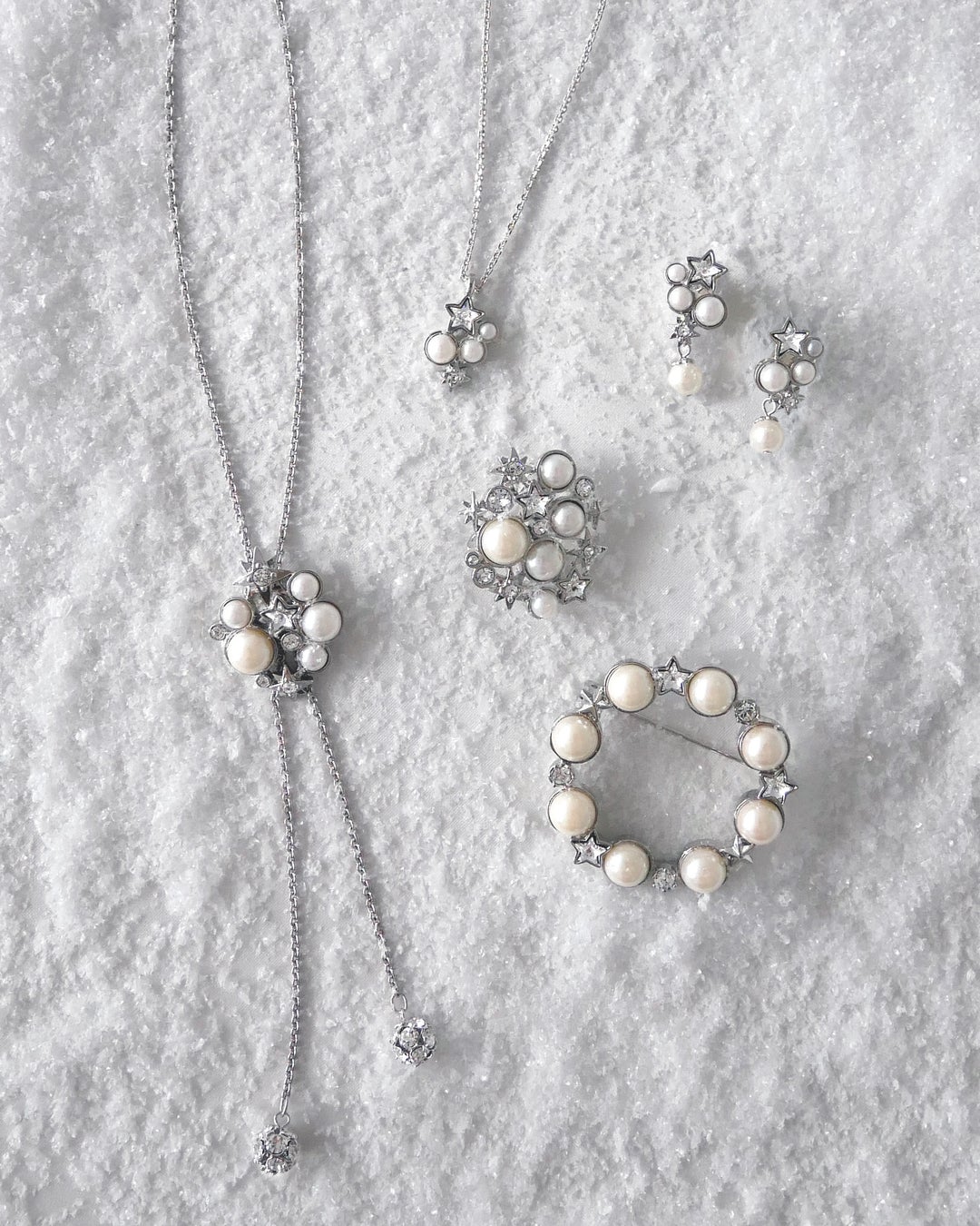 舞い降りる雪やイルミネーションの煌めきを、パールとカットガラスで表現したホリデームード漂うデザイン。スターシェイプのカットガラスが華やかなアクセントとなり、リズミカルに並んだパールが遊び心溢れる軽やかな印象を添えます。冬のお出かけやホリデーギフトにもおすすめのアイテムです。