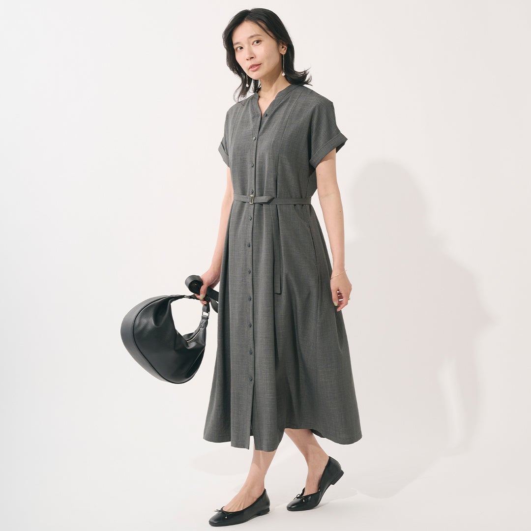 バスト部分のダーツですっきり見せ1枚でもスタイルアップします。共布のベルトをつけると細見えし、より上品な印象に。また、ウエストから広がるタックでフレアシルエットを演出し、ヒップやウエストをさり気なくカバー。顔周りをすっきり見せるキーネックは大人な抜け感をプラスします。