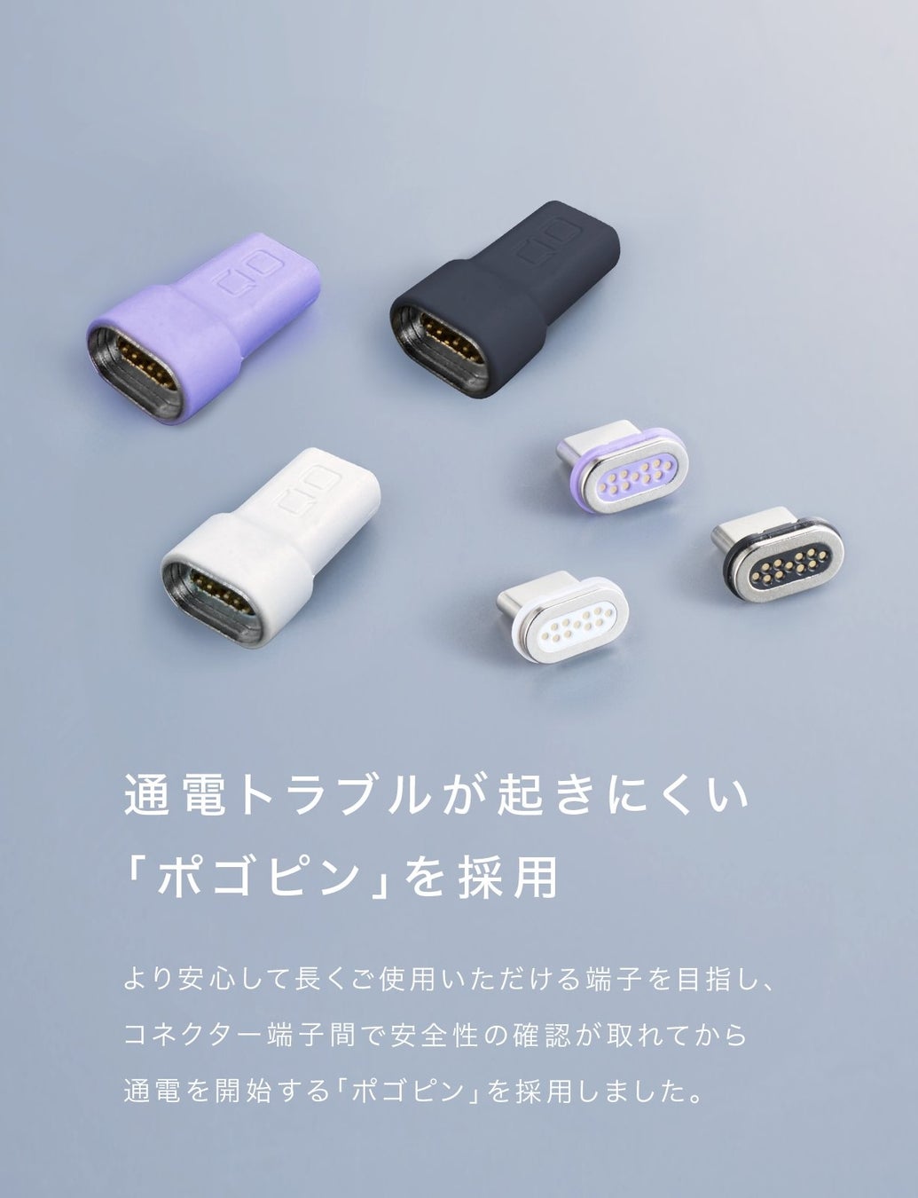 CIOマグネットケーブルと同じく、コネクター端子間で安全性の確認が取れてから通電を開始する「ポゴピン」を採用。より安心して長くご使用いただける設計となっております。