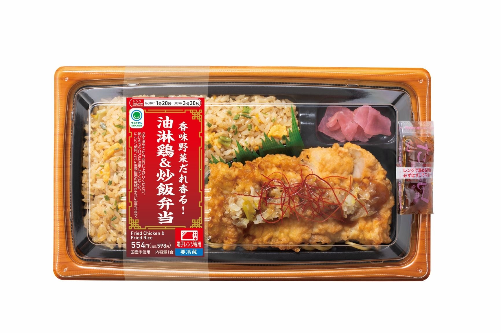 内容:中華料理で人気の油淋鶏と炒飯を組み合わせたお弁当です。清酒、米麹に漬け込んで柔らかく仕上げた鶏唐揚げにねぎやおろし生姜など香味野菜を使用した風味豊かなタレをかけて食べる油淋鶏です。さわやかな酸味と甘み、ねぎやおろし生姜の香味野菜の風味が口に入れた瞬間にふわっと広がります。