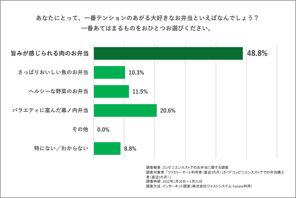 「肉弁当 四天王」キャンペーン開始に際し、ファミリーマート利用者を対象にアンケート調査を実施。調査では好きな弁当ジャンルの圧倒的1位に「肉」が選ばれ、お客さまからもファミリーマートの肉弁当に高いご期待をいただいているという結果が出ました。この結果を受けて、肉のうまみにこだわった「肉弁当 四天王」キャンペーンを2月8日(火)より展開いたします。