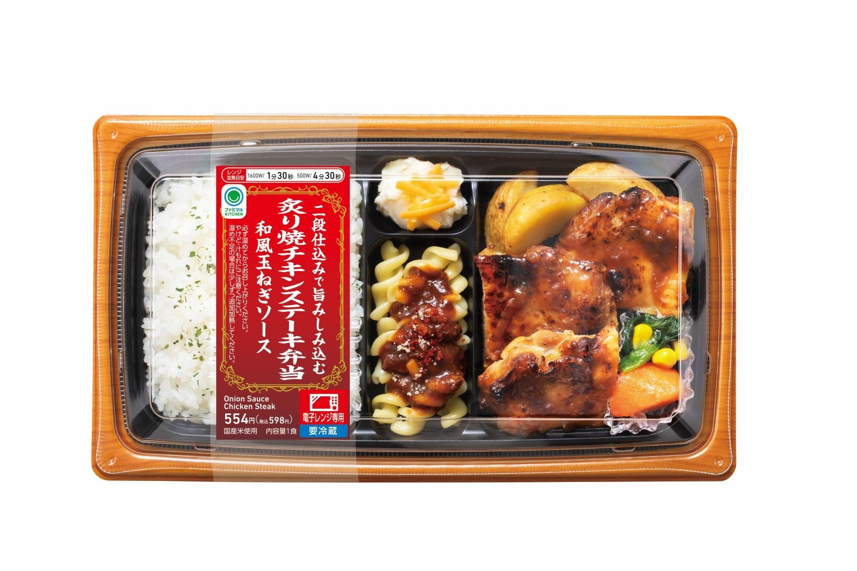 内容:一度目は清酒、生姜、二度目は醤油、米麹などで二段階に分けてもみ込むことで、味が浸み込んだジューシーなチキンステーキに仕上げました。表面を炙り焼きにすることで香ばしさがアップしています。ソースは、オニオンソテーと生のみじん切りの2種類の玉ねぎを使用することで旨みと食感を出し、ワインなどでコクを出した醤油ベースの和風たまねぎソースを使用しております。