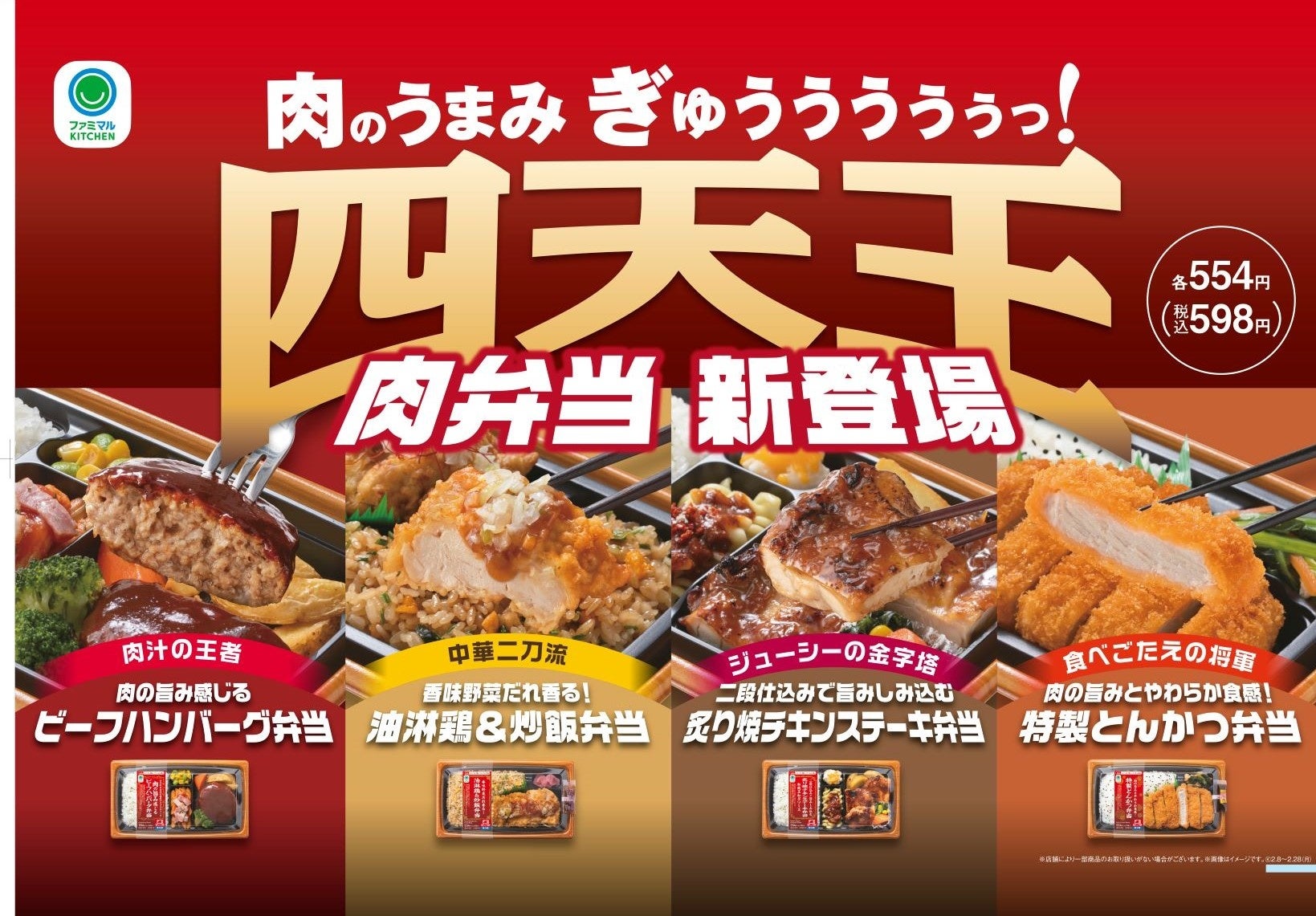 このたびは、「40のいいこと!?」の5つのキーワードの1つである「もっと美味しく」の一環として、昨年10月に誕生した新プライベートブランド「ファミマル」より、肉のうまみにこだわった4種類の弁当、「肉弁当 四天王」を発売し、2月8日(火)より全国のファミリーマートでキャンペーンを展開いたします。