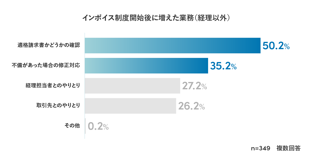 インボイス制度開始後に増えた業務として最も多かったのは「受け取った請求書が適格請求書かどうかの確認」、次点は「受け取った請求書に不備があった場合の修正対応」でした。経理部門だけでなく、取引先と請求書のやりとりを行う他部門においても、インボイス制度を正しく理解し、請求書の内容確認や修正に関するやりとりを行うことが求められており、業務負荷が増大していることが分かりました。