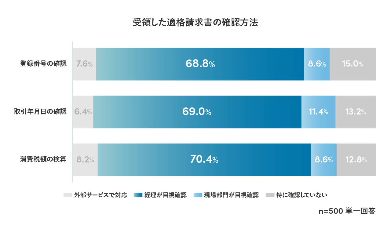 取引先から受け取った請求書が適格請求書の要件を満たしているかについて、どのように確認しているか聞いたところ、約7割は「経理担当者による目視確認」でした。適格請求書に求められる要件は、項目が多い上に内容が複雑であるため、目視で確認すると多くの時間がかかります。それにより、経理担当者の業務負荷増大につながっていることが予想されます。その一方で、登録番号の確認を特にしていないと回答した人も15.0%おり、受け取った請求書が適格請求書かどうかの確認を行っていない人も一定数いることが判明しました。
