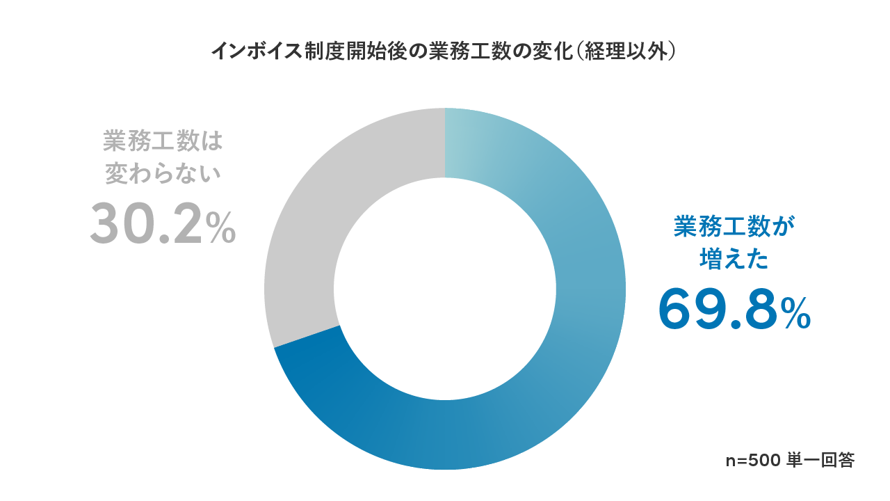 また、経理以外の部門に所属する500名を対象に、インボイス制度開始後の業務について聞いたところ、「業務が増えた」と回答した人は69.8%でした。