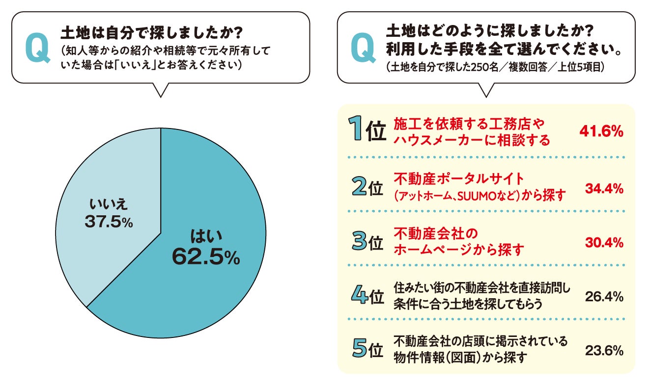 注文住宅購入者に土地を自分で探したか聞いたところ、知人等からの紹介や相続等ではなく自分で探した人は62.5%でした。土地の探し方で最も多かったのは「施工を依頼する工務店やハウスメーカーに相談する」で41.6%でした。2位は「不動産ポータルサイトから探す」で34.4%、3位は「不動産会社のホームページから探す」で30.4%と3割を超えました。