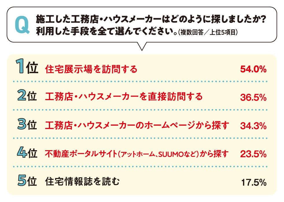 工務店・ハウスメーカーの探し方で最も多かったのは「住宅展示場を訪問する」で半数を超えました。2位は「工務店・ハウスメーカーを直接訪問する」で36.5%、3位は「工務店・ハウスメーカーのホームページから探す」で34.3%でした。また5人に1人が「不動産ポータルサイトから探す」と回答しました。