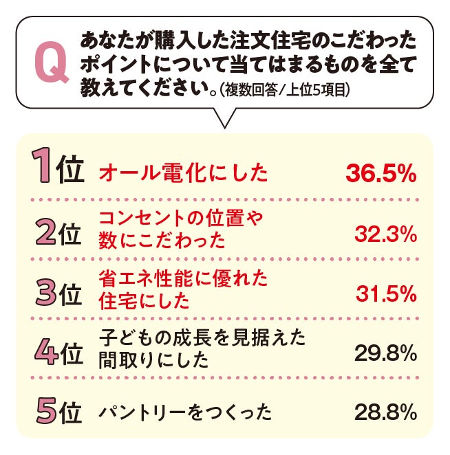 購入した注文住宅のこだわったポイントについて聞いたところ、1位は「オール電化にした」、2位は「コンセントの位置や数にこだわった」、3位は「省エネ性能に優れた住宅にした」でした。特に省エネ性能については2025年4月から全ての新築住宅で省エネ基準適合が義務付けられるため、今後注目が集まりそうです。