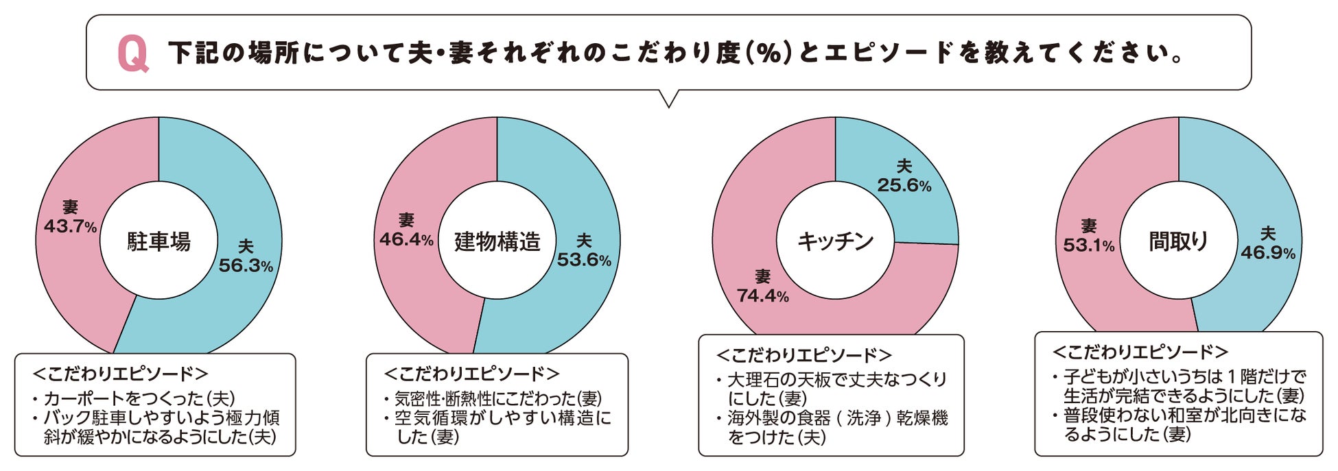 購入した注文住宅について、夫・妻それぞれのこだわり度を聞いたところ、「駐車場」「建物構造」では夫、「キッチン」「間取り」では妻の割合が高く、場所によってこだわりの違いが見られました。