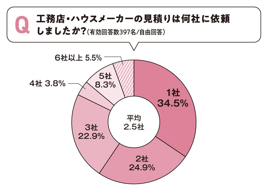 見積りを依頼した工務店・ハウスメーカーの数を聞いたところ平均2.5社でした。最も多かったのは「1社」で34.5%、次いで「2社」24.9%でした。