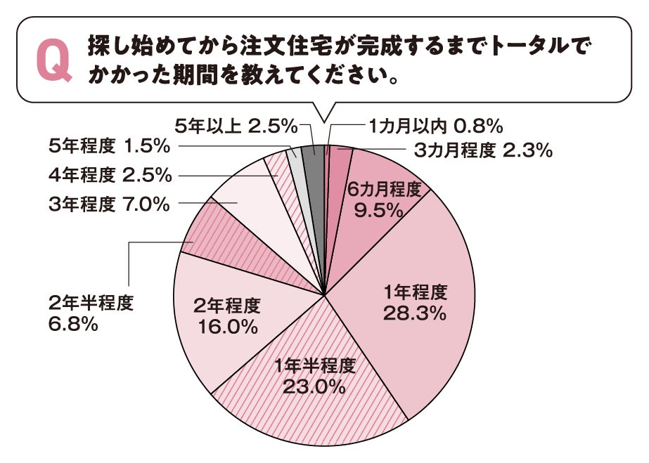 探し始めてから注文住宅が完成するまでトータルでかかった期間を聞いたところ、最も多かったのは「1年程度」で28.3%、次いで「1年半程度」で23.0%でした。